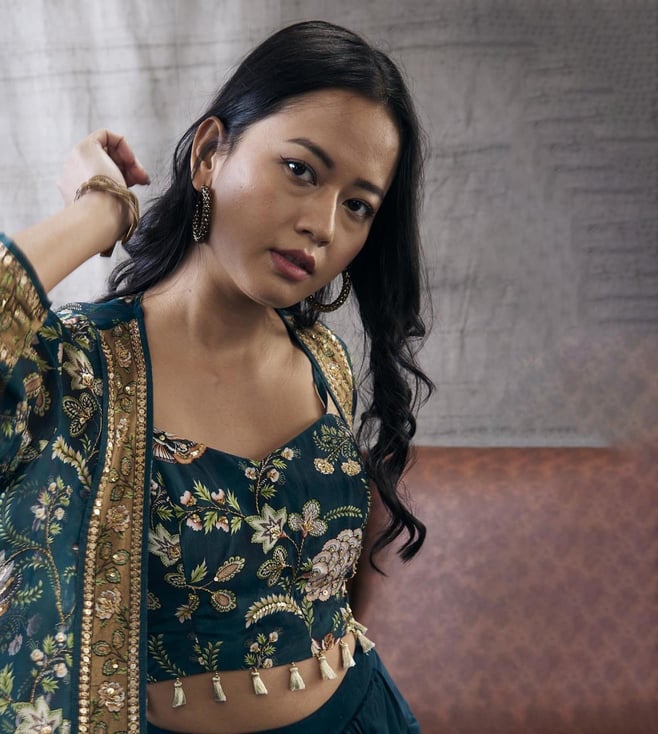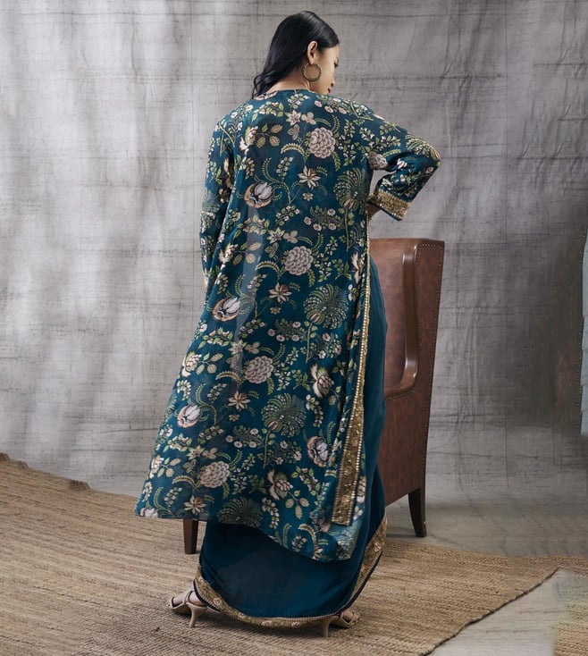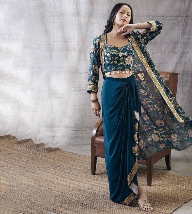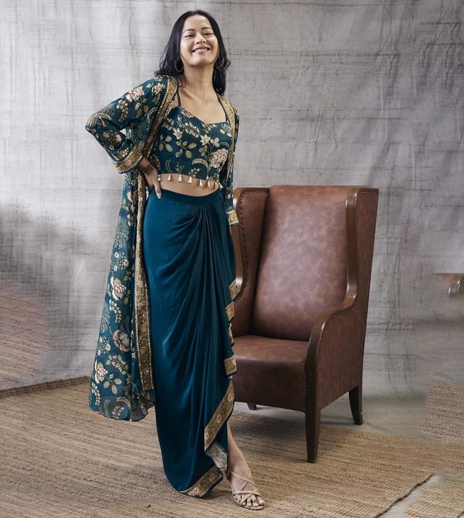 Soup By Sougat Paul Green Mehr Printed Drape Skirt with Top and Jacket