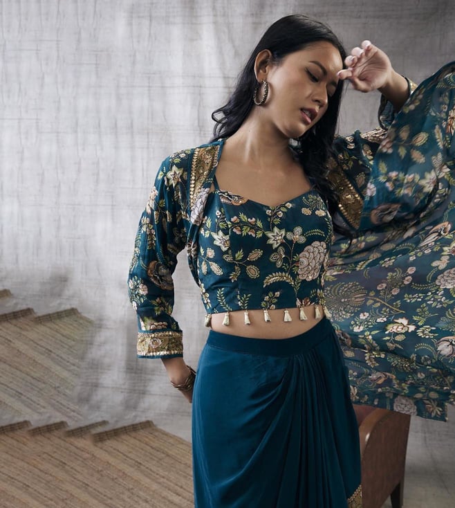 Intrigue one and all with this printed drape skirt set with a jacket, that will add a dash of extra charm to your look. Crafted using premium quality crepe and flat chiffon, it will be very soft on the skin. Disclaimer: Product colour may slightly vary due to photographic lighting sources. Country of Origin - India.