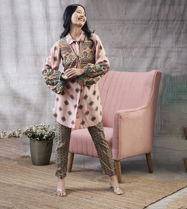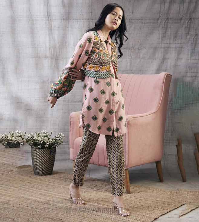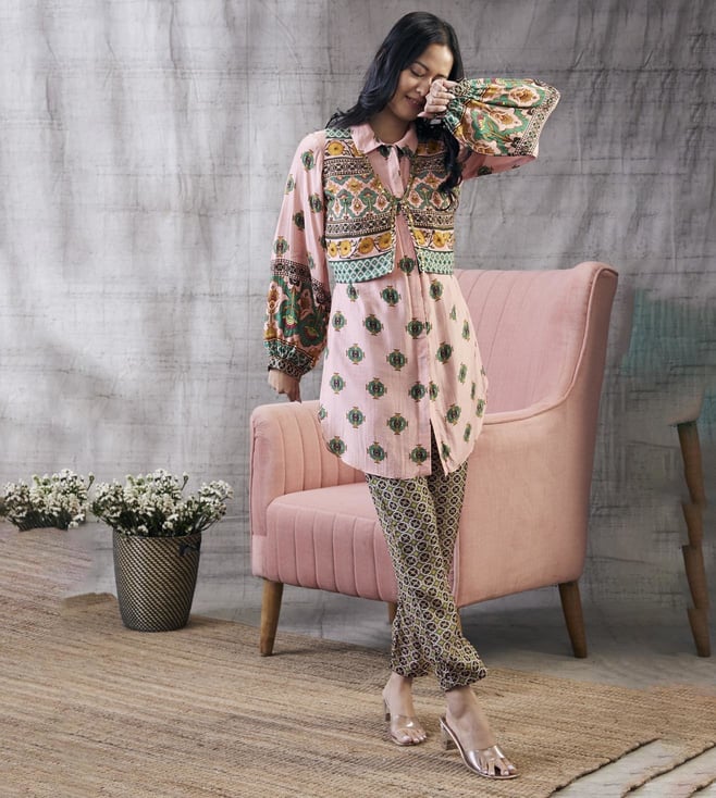 Vaunt a new trend by wearing this printed co-ord set with a jacket. Crafted using premium quality Malaysian silk, it will be very soft on the skin. Disclaimer: Product colour may slightly vary due to photographic lighting sources. Country of Origin - India.