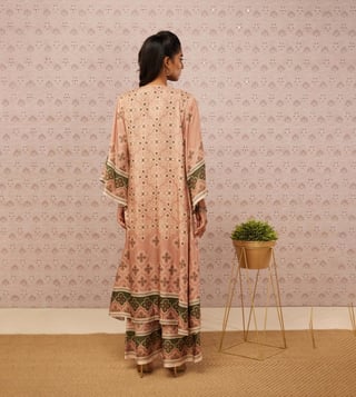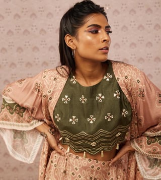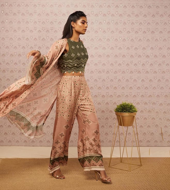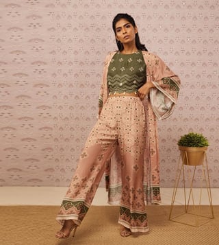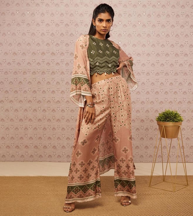Soup By Sougat Paul Peach & Green Bandhej Printed Top With Bottom and Jacket