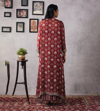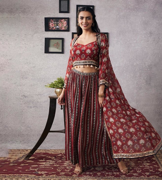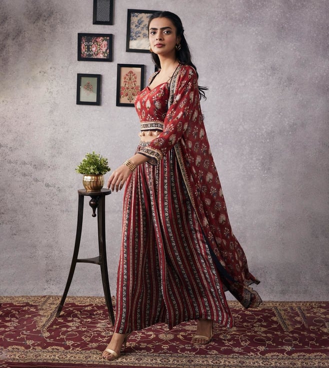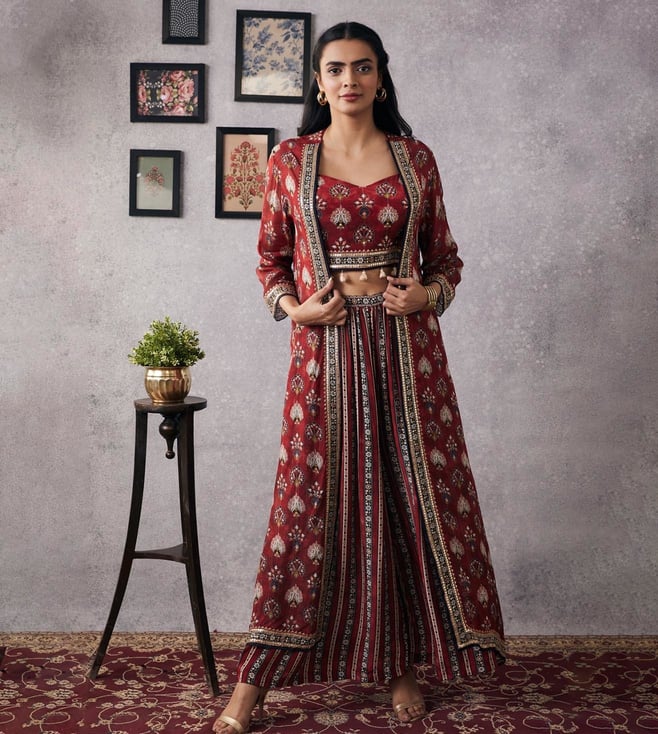 Soup By Sougat Paul Red Sarouk Embroidered Top With Jacket and Skirt