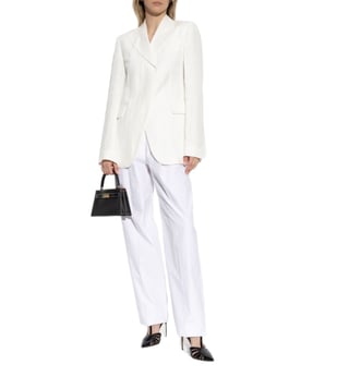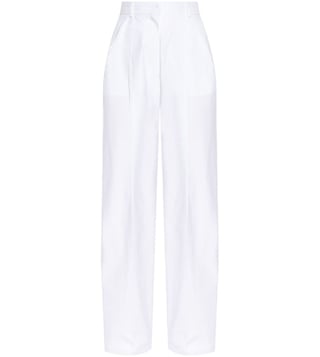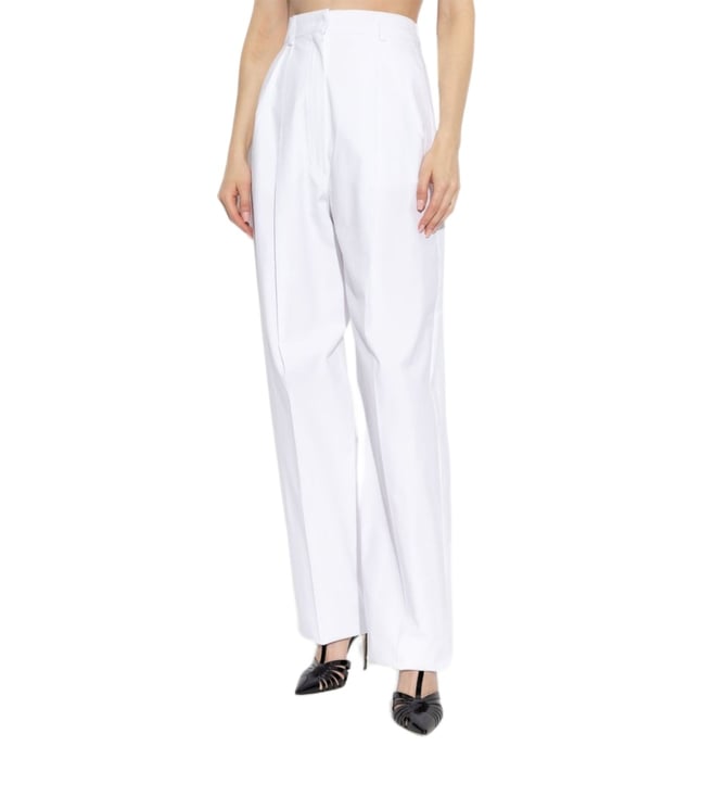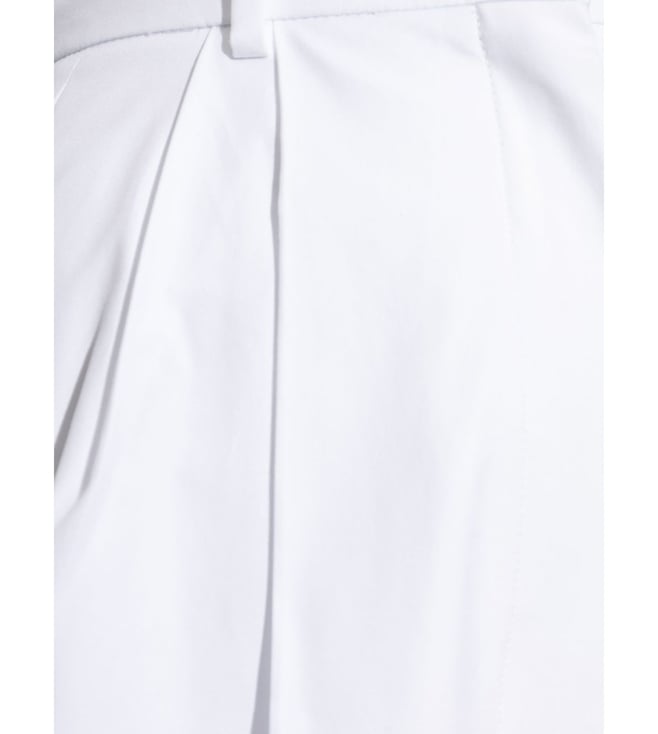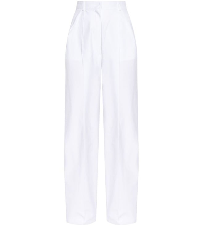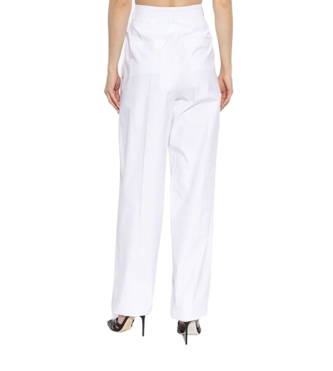 Elevate your wardrobe with the Sportmax White Loose Fit Trousers. Designed with sportmax white cotton leone trousers with belt loops, concealed side pockets, a wide leg silhouette, a pleated front design and an eyelet and zip fastening. these trousers combine comfort and sophistication for everyday wear. Products purchased from Darveys are supported exclusively by the warranty/exchange policies of Darveys and its partner boutiques. Brand owners and their channel partners are not responsible for exchange/warranty services for items purchased through Darveys.