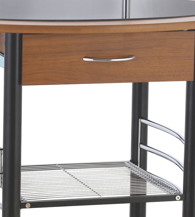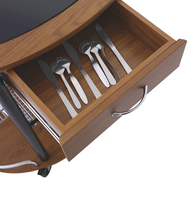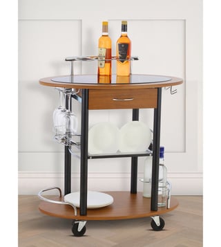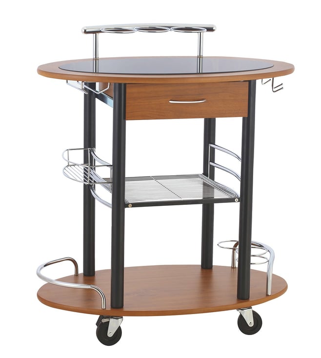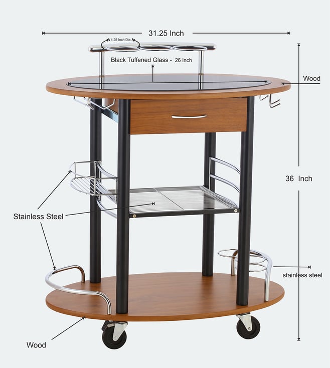 This four-tier wooden serving trolley has ample space for bottles and accessories. A stylish, sleek design to match the sophisticated interior, it has an oval-shaped tempered glass and a rust-proof metal frame in a chrome finish. It is made in Taiwan.