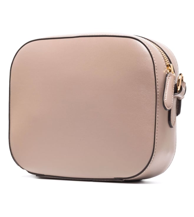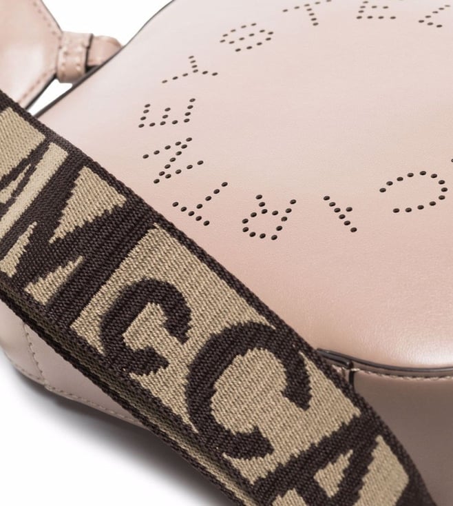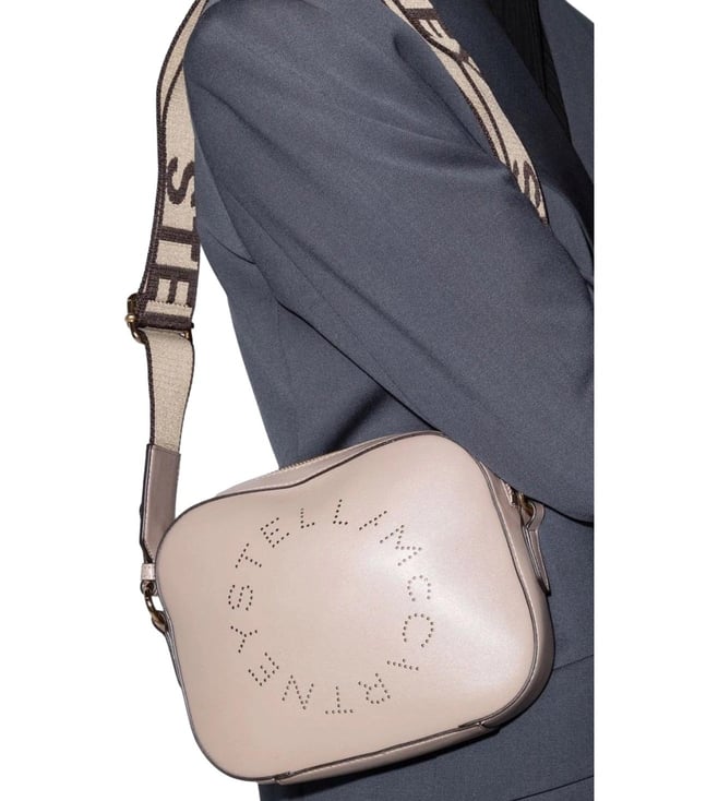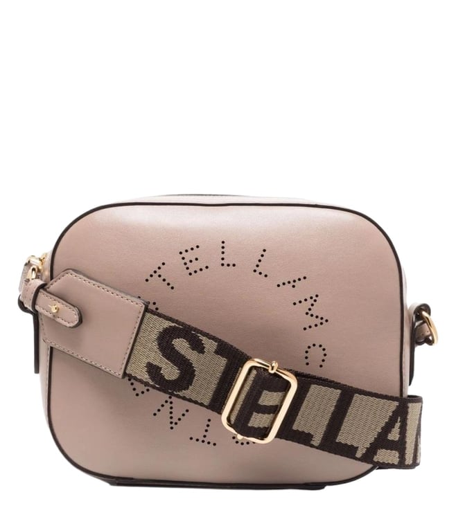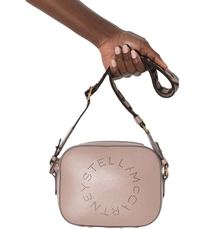 Moss grey faux leather stella logo camera bag from stella mccartney featuring perforated logo detail, gold-tone hardware, top zip fastening, main compartment, adjustable shoulder strap and internal patch pocket.