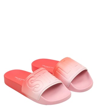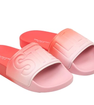 A pair of pink and red ombre sliders for girls by Stella McCartney Kids. Great for wearing by the pool or pairing with casual outfits, they have comfortable moulded footbeds made in soft-yet-sturdy rubberised material. The sole is lightly treaded underfoot and the flexible rubber foot strap is embossed with the label's instantly recognisable logo.