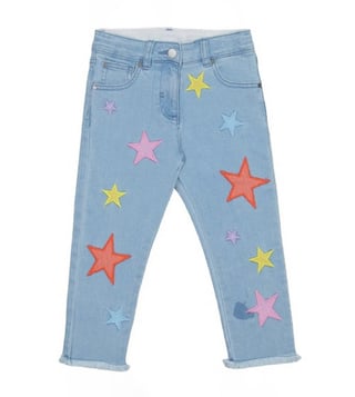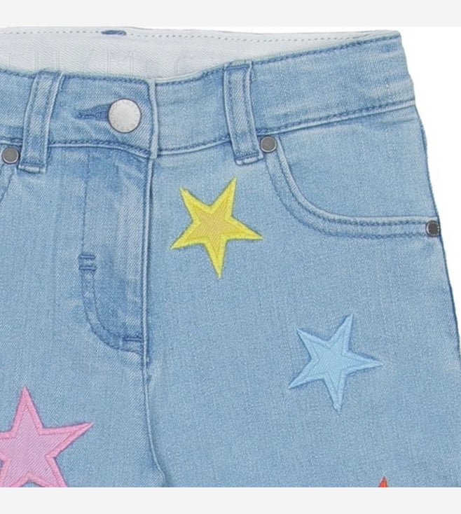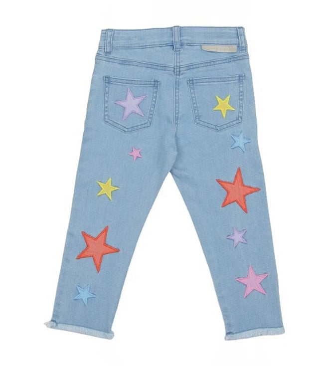 Light blue wash denim jeans by Stella McCartney Kids, with added stretch for comfort. This fun design has five pockets, fringed hems and all-over multicolour appliquéd stars.