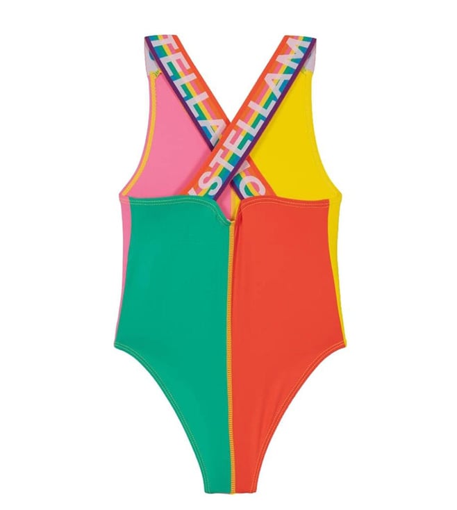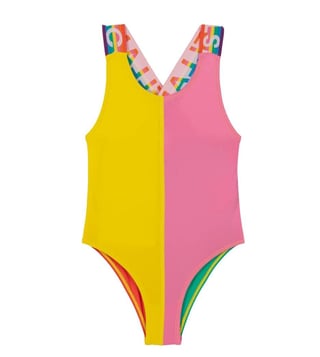 In attractive and vibrant color block details this swimwear is by Stella McCartney Kids. Using recycled material, it is made in silky smooth fabric with UPF50 plus. It is ultra comfortable to wear and has elasticated cross-over back straps with bold logo lettering for added edginess.