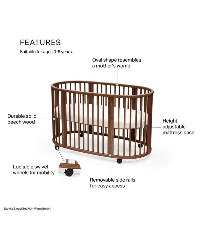 Your babys crib is the heart of your nursery. It should be beautiful, functional and above all, safe and soothing for your little one. Made of solid European beech wood, with adjustable height, Stokke Sleepi accommodates the changing needs of your growing child. Soft oval design cocoons your baby offering comfort and familiarity for restful sleep and the sweetest of dreams. Stokke Sleepi Bed can be used from birth to 5 years so your child can enjoy their bed throughout childhood. Adjust the height position of the mattress as your child gets bigger and reaches the curious climbing stage.
