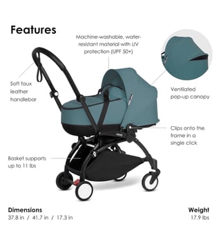 The YOYO Stroller with bassinet is a versatile, ultra-compact and super sturdy stroller that can be used for a newborn (with a bassinet). The bassinet is multifunctional as it can be used up to 6 months with a stroller (or 9 kg) and can be detached from the stroller to be used a carrycot as well. Post 6 months, it can be used with 6+ pack (sold seperately). It is ultra-compact and dissembles into two half-shells for optimal storage.