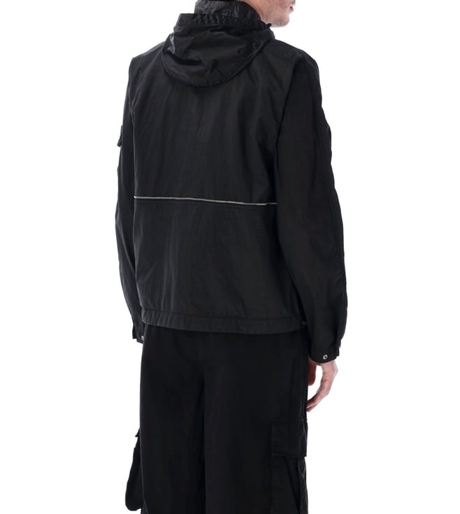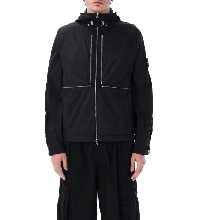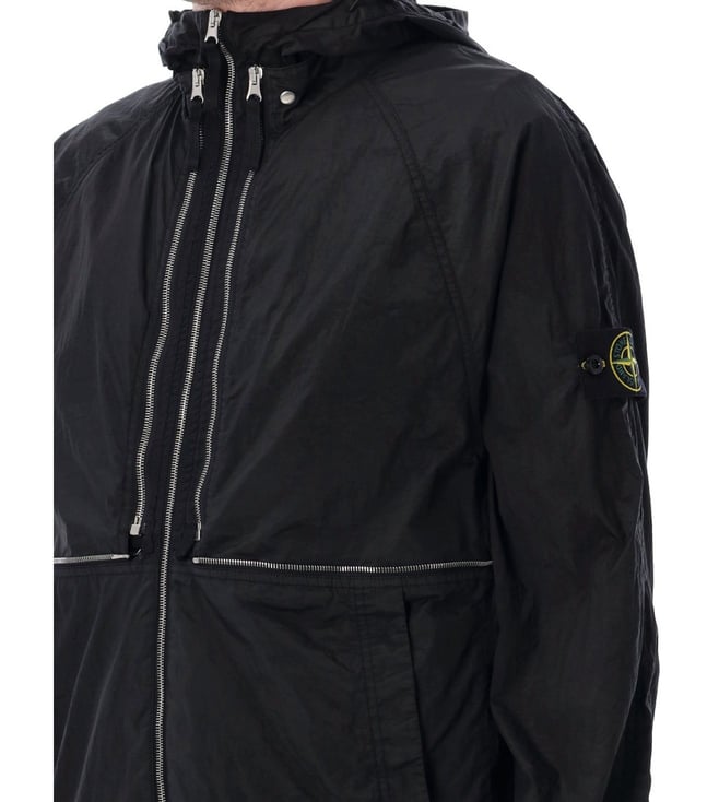 Elevate your style with the Stone Island Black Windbreaker Jacket. Front twoway zip fastening drawstring hood multiple zipfastening pockets pressstud fastening cuffs.