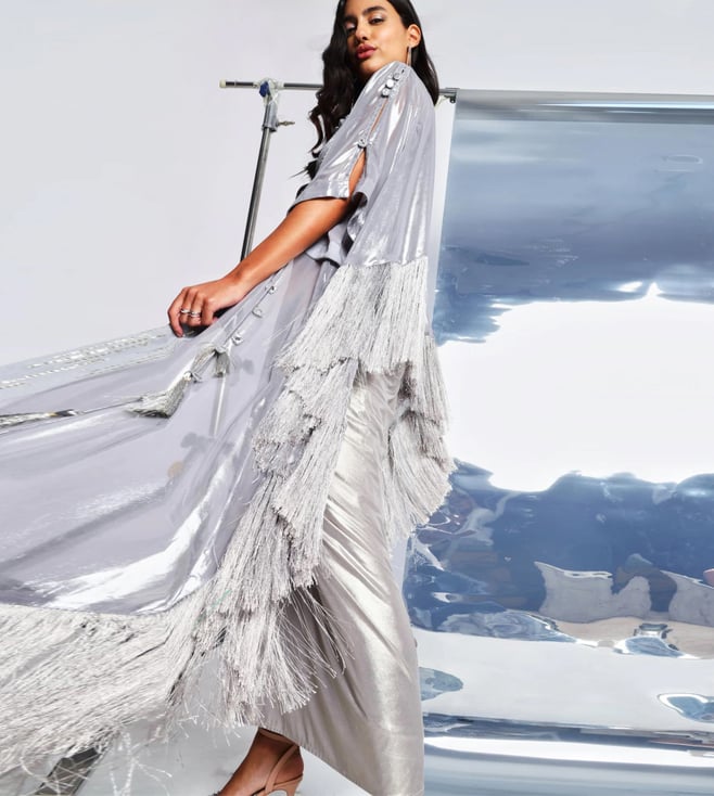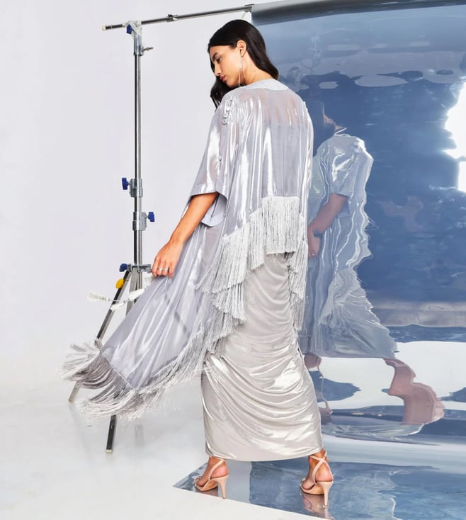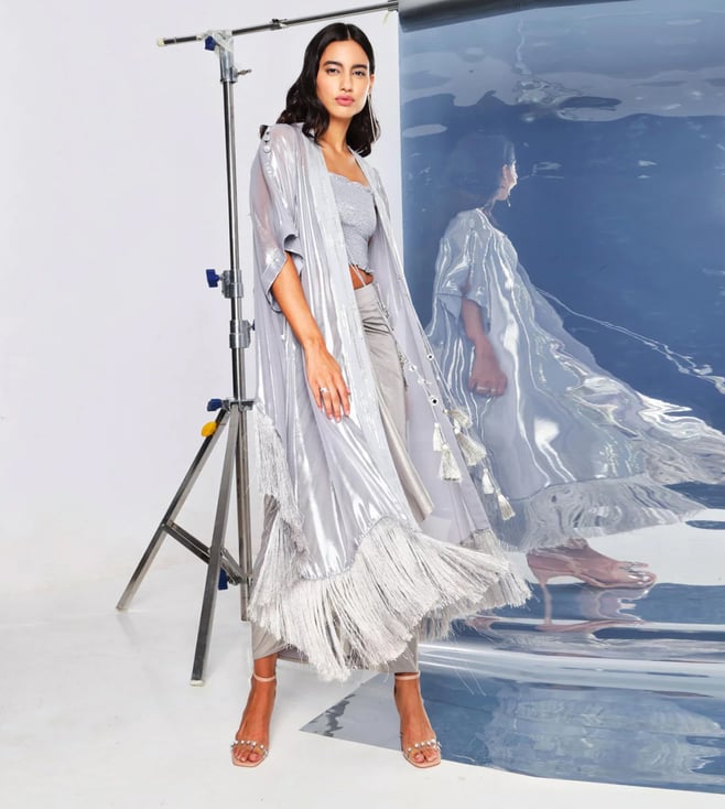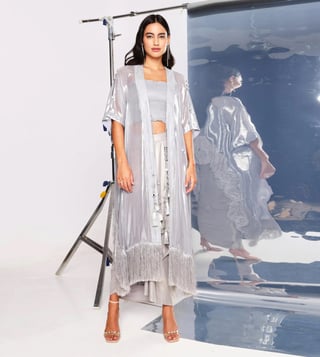 Elevate your wardrobe with this georgette lame duster - the epitome of glamour and sophistication. The high-low hem, adorned with exquisite fringe details, adds a playful yet elegant dimension to this already chic piece. The front tie-up string with mirror detailing not only cinches the waist for a flattering silhouette but also adds a touch of contemporary edge. Disclaimer: Product colour may slightly vary due to photographic lighting sources. Country of Origin - India.