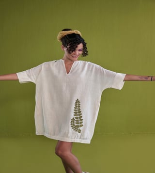 Channel a winning style effortlessly by wearing this dress. Crafted in handspun and handwoven khadi, it has hand and machine embroidered with a fern motif. Disclaimer: Product colour may slightly vary due to photographic lighting sources. Country of Origin - India.