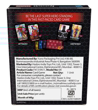 Superhero Toy Store and Hasbro present this card game that your child can play during leisure hours. In this fast-and-furious, easy-to-learn card game, players battle it out to be the last superhero standing. Players choose a character deck, then draw and play cards to attack opponents, defend themselves and heal.