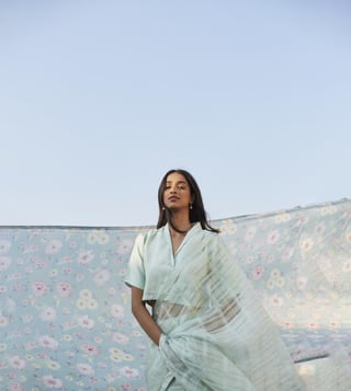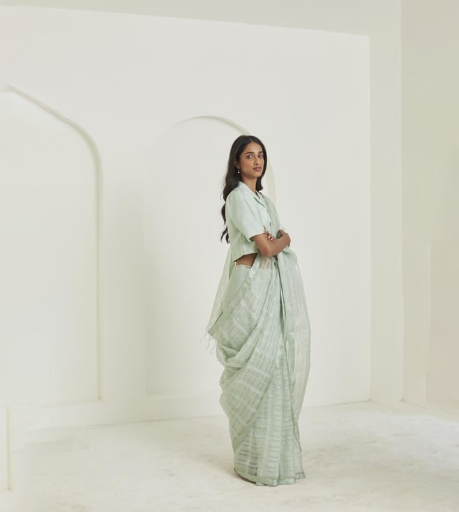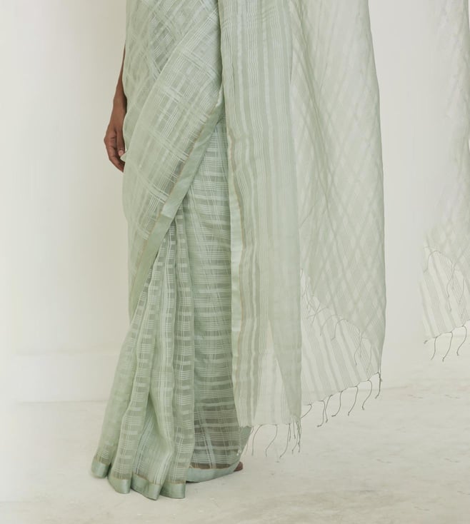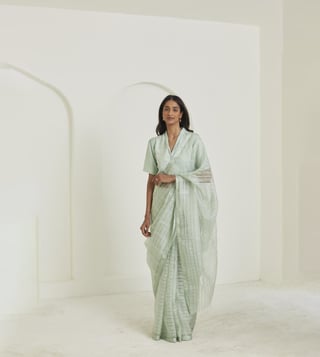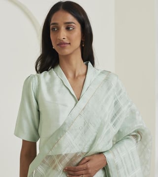 Elevate your look by wearing this saree from the Be a poem collection. This saree is made using handwoven mulberry organza silk and flaunts a self-checks design. Disclaimer: All other items in the image are only for display purposes and will not be a part of the delivery content. Product colour may slightly vary due to photographic lighting sources. Country of Origin - India.
