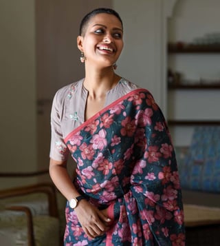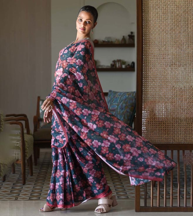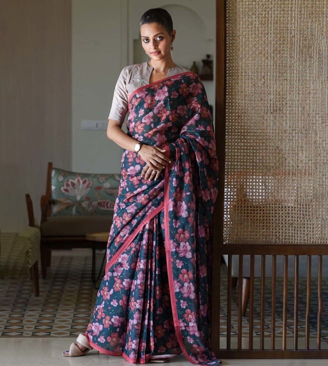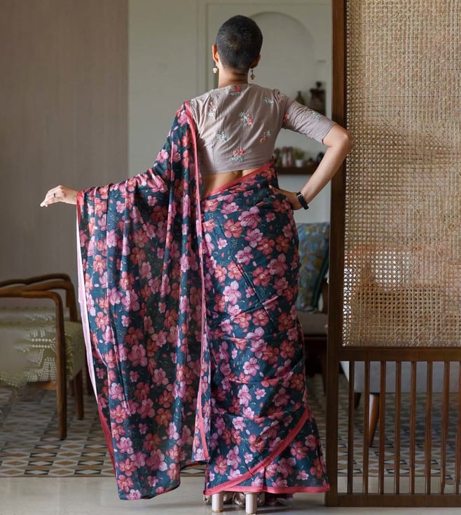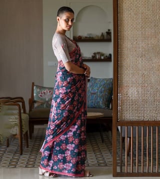 Blend in subtle charm and comfort by wearing this blue saree from Suta. Tailored to sartorial perfection from premium quality fabric, it assures a soft and soothing touch against the skin. The printed pattern makes it a captivating choice. Join the league of fashion elites flaunting the staple.