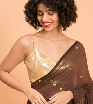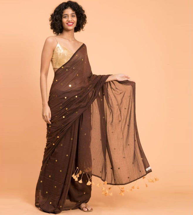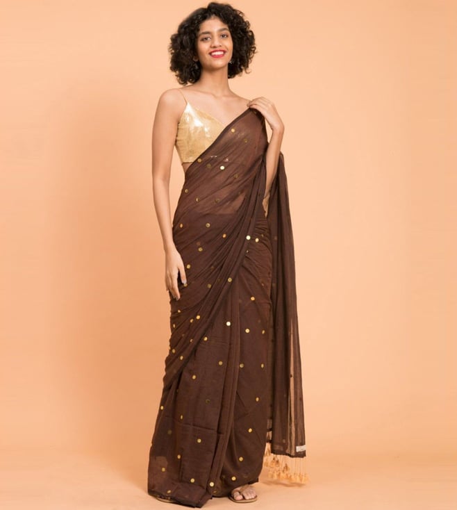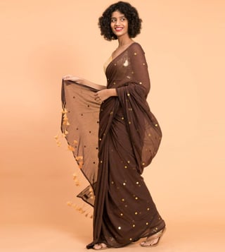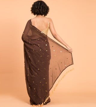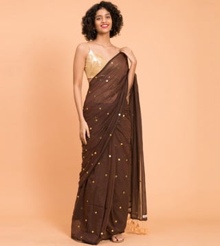 Get ready to be overwhelmed with a flurry of compliments by wearing this brown saree from Suta. Tailored to sartorial perfection from premium quality fabric, it assures a soft and soothing touch against the skin. The embellished pattern makes it an eccentric choice.