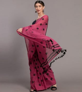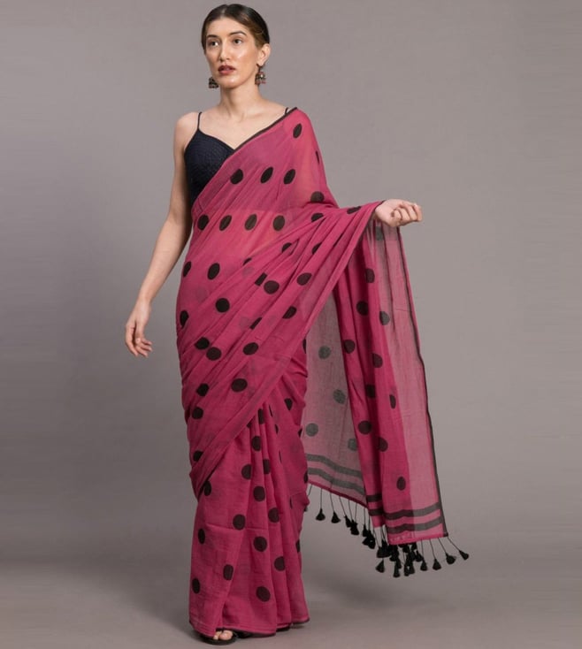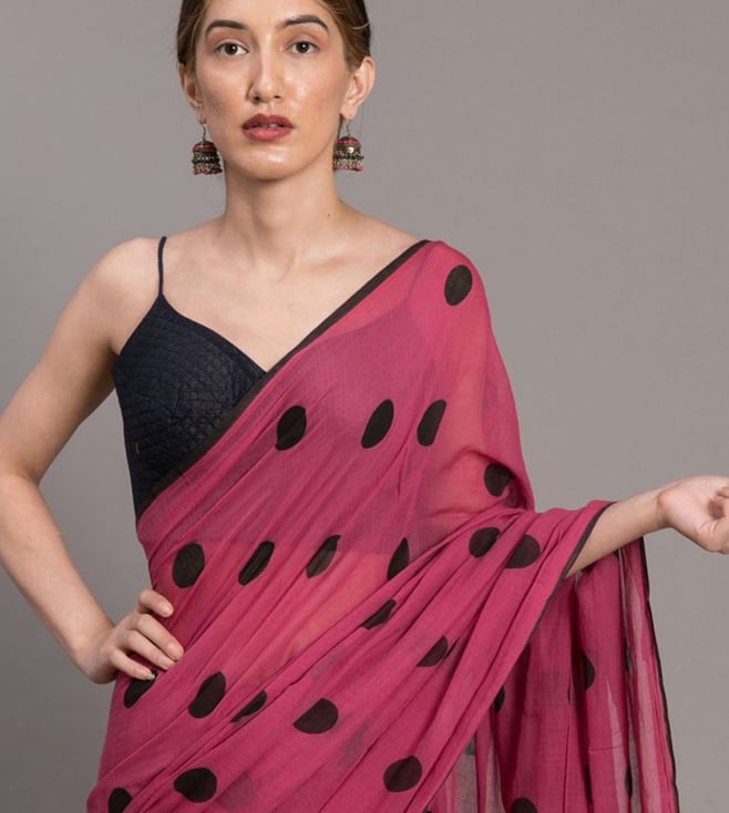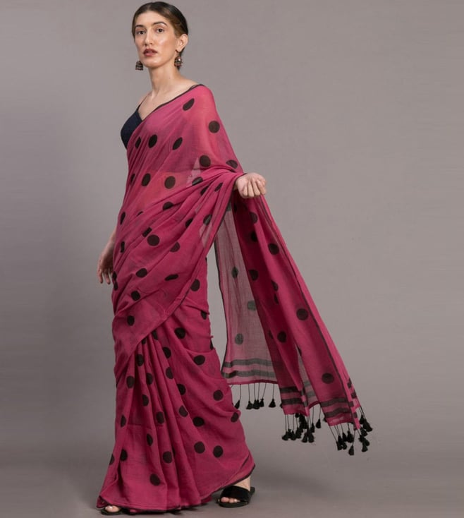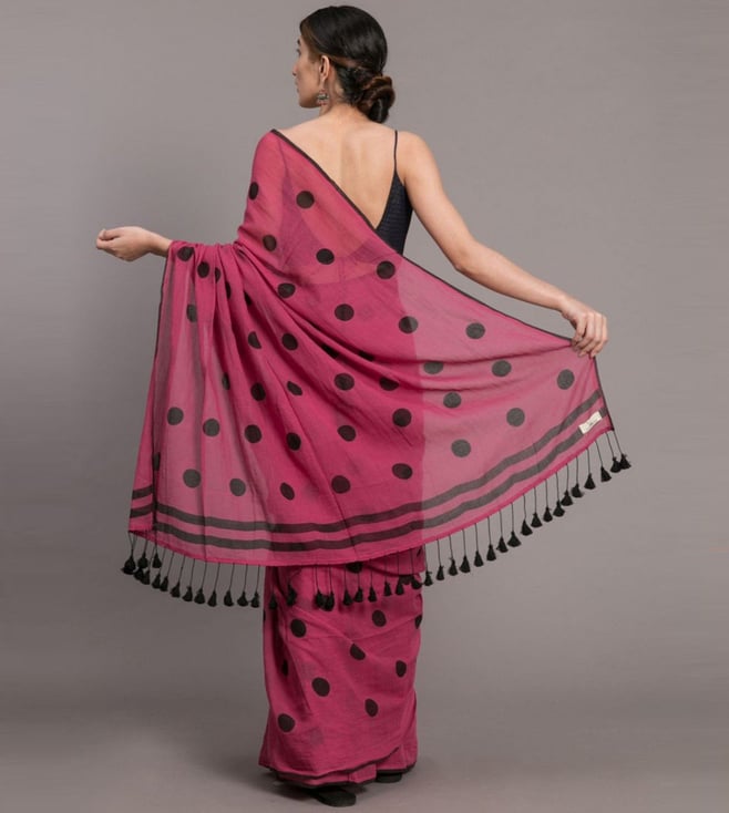 Suta Pink & Black Cotton Polka Dots Saree Without Blouse