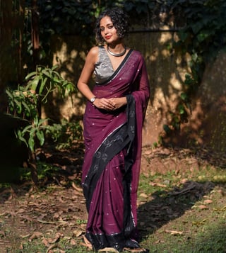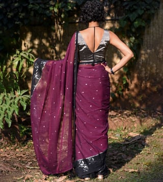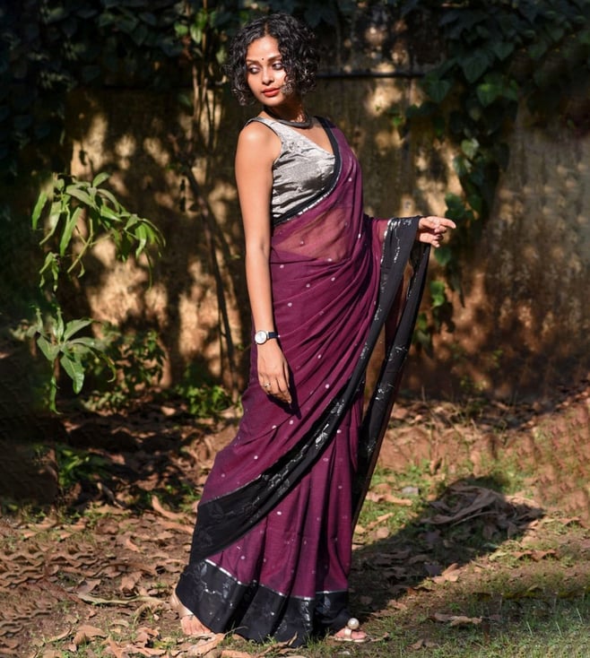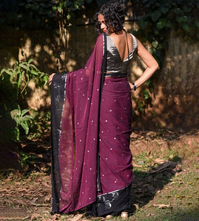 Walk in style by wearing this purple saree from Suta. Tailored to sartorial perfection from premium quality fabric, it assures a soft and soothing touch against the skin. The woven pattern makes it a bewitching choice.