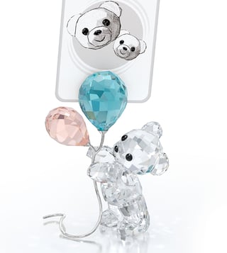 Kris Bear takes care of your picture or name card in this adorable Swarovski figurine. Crafted in clear, pink, and blue sparkling crystal, his lifelike pose, rendered in 627 shining facets, endear him to you immediately. The balloon string, made from polished metal, stabilizes the figurine while a clip holds your picture safely in place. A charming gift for parents and a must-have for Kris Bear enthusiasts. Decoration object. Not a toy. Not suitable for children under 15 years.