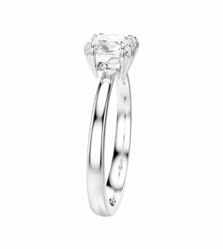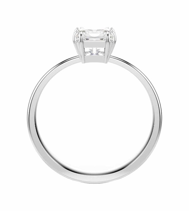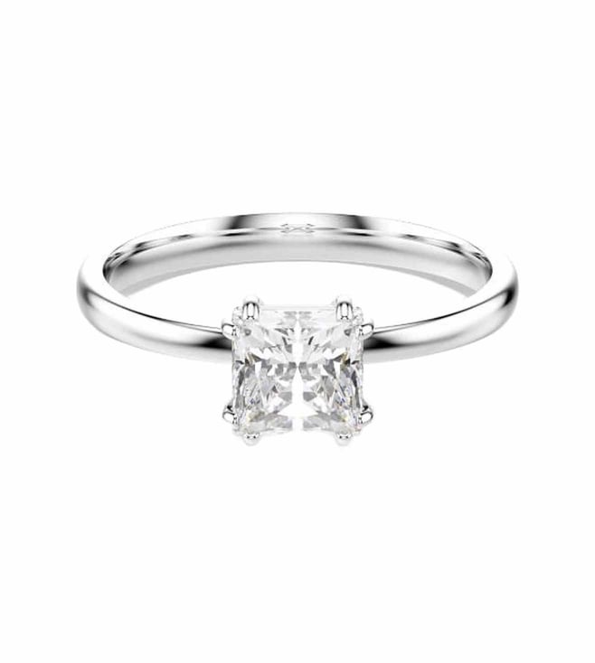 Simplicity shines brightly in this timeless and romantic ring. Effortlessly elegant, the rhodium plated design features a brilliant square cut swarovski zirconia, expertly faceted to catch the light. This ring is ideal for mixing and matching with other jewelry pieces to create a personalized style story. A perfect gift for yourself or someone you love.
