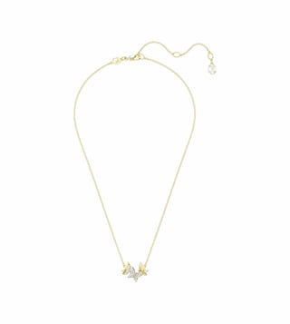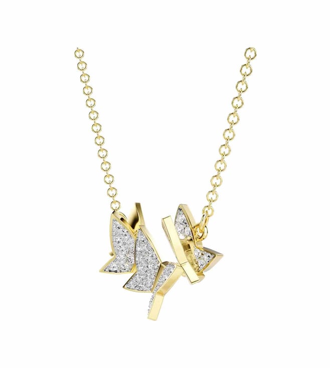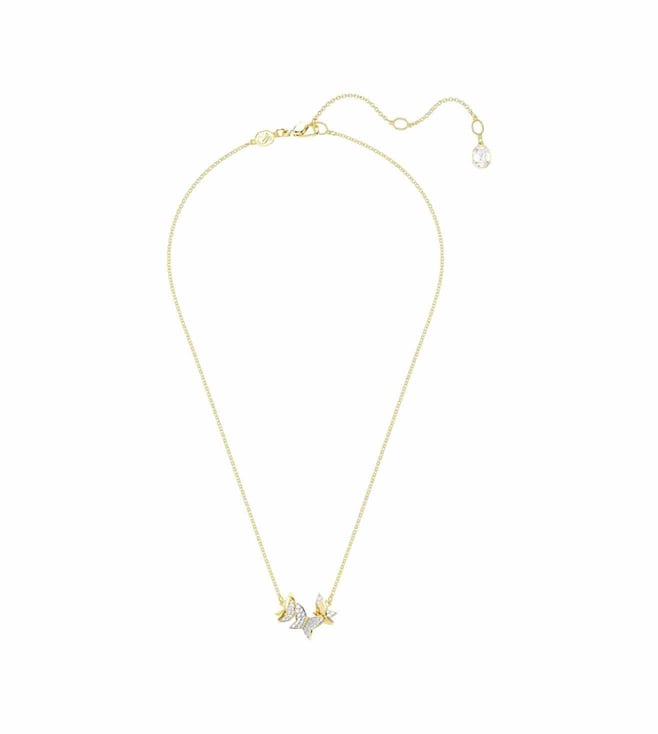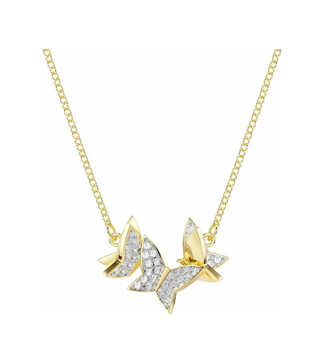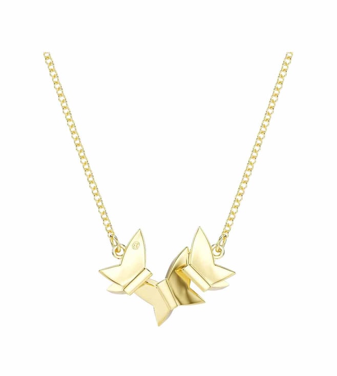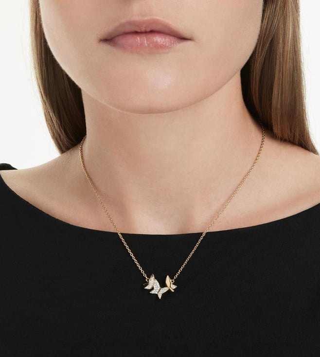 An elegant choice for everyday, this delicate necklace will become a new wardrobe staple. It features shimmering pava butterfly motifs suspended from a gold tone plated chain. The perfect partner to white t shirts, cashmere jumpers, denim, or eveningwear a essentially, anything goes.