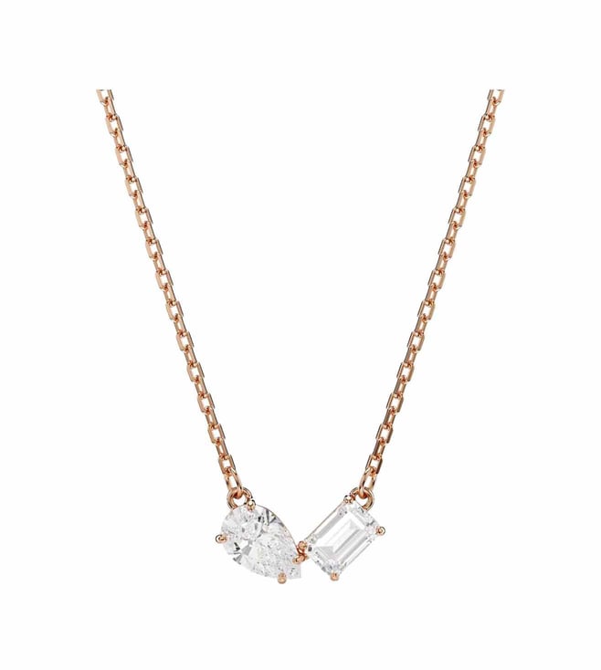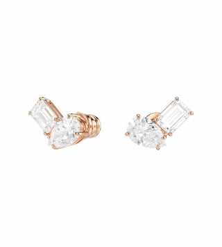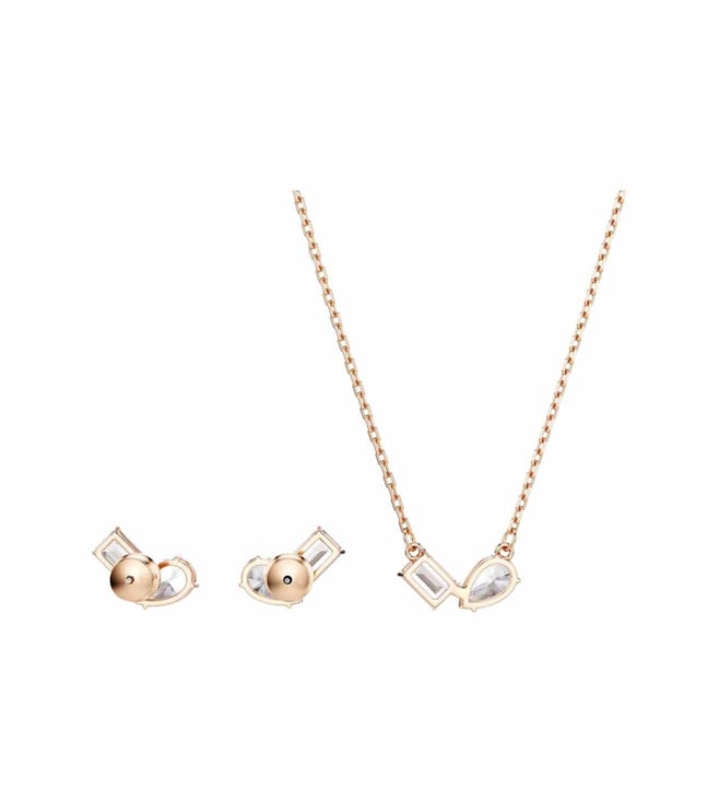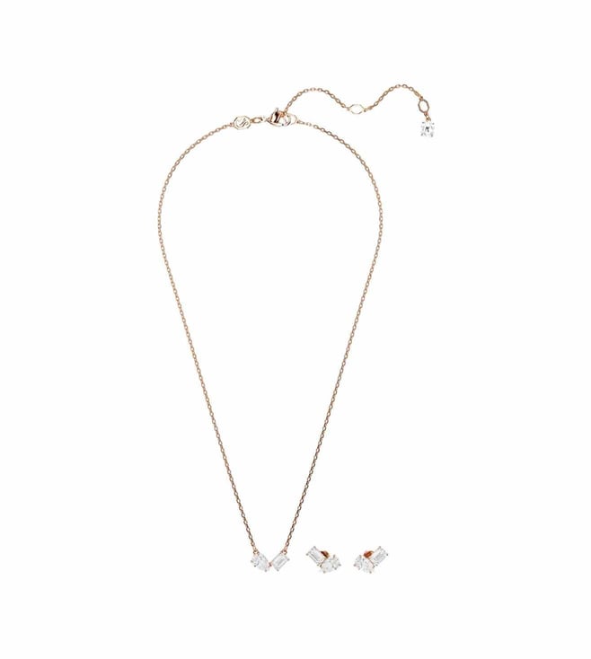 Create a look of overall elegance with this matching mesmera pendant and earrings set. The eye catching pieces are rose gold tone plated and each feature a pair of prong set swarovski zirconia in pear and octagon step cuts. Simple yet refined, this set makes a perfect gift for any special occasion.