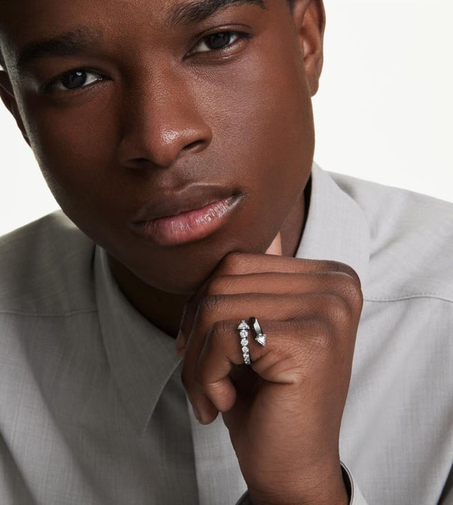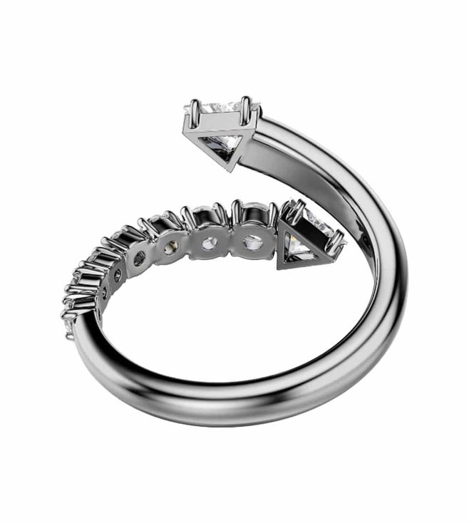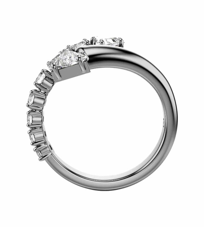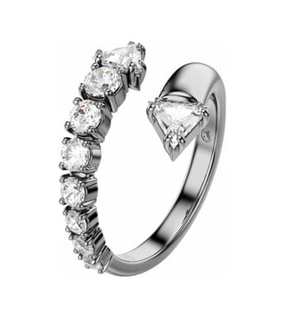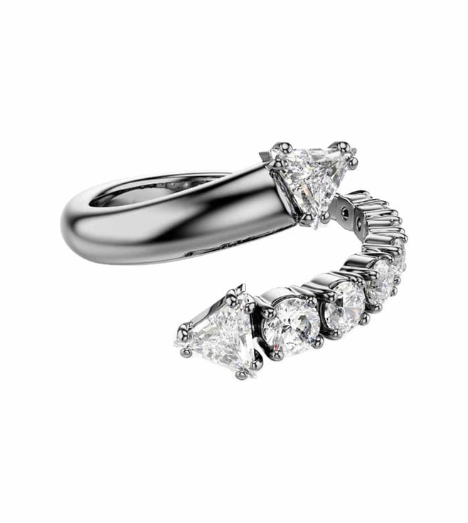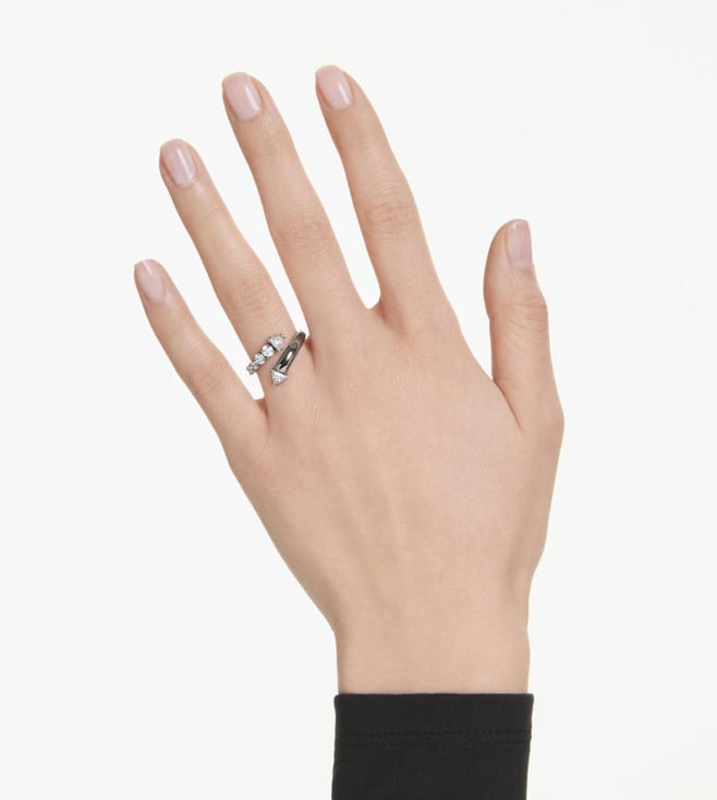 This sublima ring offers an impactful alternative to everyday styling. The ruthenium plated band is open ended and spirals around the finger with a variety of clear swarovski zirconia in prong settings. The spiky tips add a contemporary finish and match perfectly with other jewelry pieces from the same expressive family.