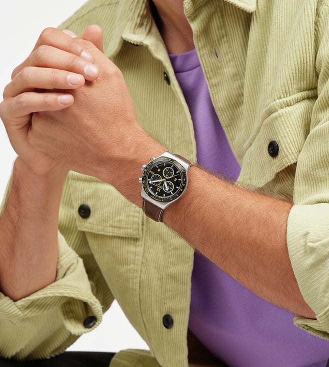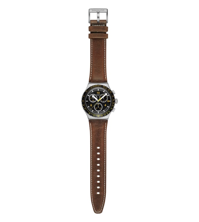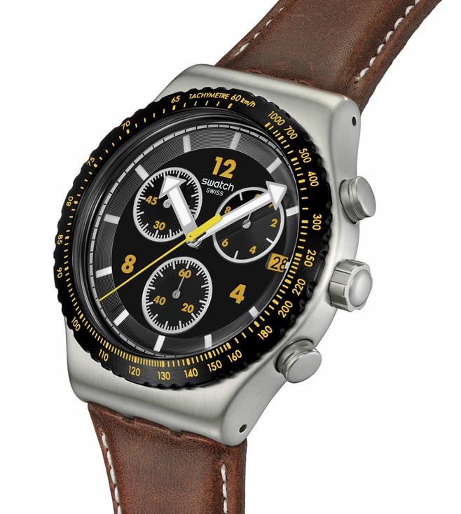 This stainless steel chronograph features a black sun-brushed dial with yellow printed numerals, glow-in-the-dark hour markers and a yellow date window with black print at 3 o'clock. Arrow-shaped, silver-colored hour and minute hands with glow-in-the-dark effect and a yellow chronograph seconds hand tell the time. It has a brushed stainless steel case and a bezel with black PVD coating and yellow printed tachymeter scale. A brown leather strap with contrasting stitching, brown leather loops and brushed stainless steel half-buckle complete the watch.