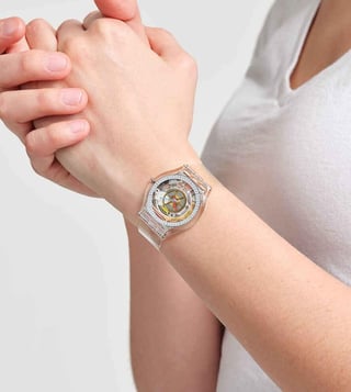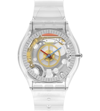 A silvercolored ring gleams on the dial of this transparent ultraslim watch with red, blue, and yellow hands and black indexes. A clear, shiny biosourced case and clear TPU strap complete the look.