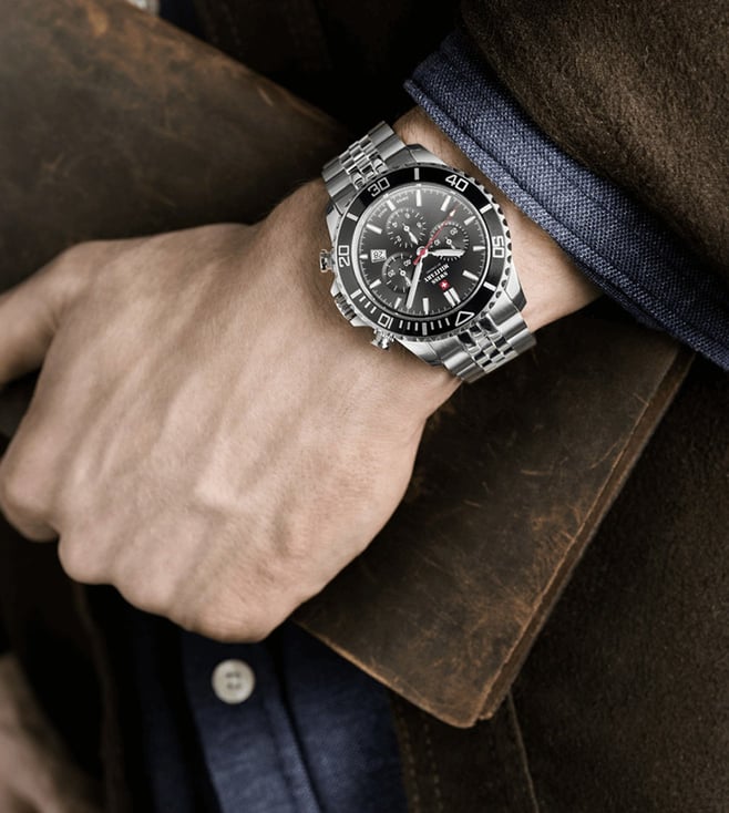 The SM34103 Swiss Sports Chronograph Watch is a dynamic fusion of style and precision. The black sunray dial, adorned with white luminous indices and hands is covered by scratch-resistant sapphire glass. The inclusion of a red chronograph secondhand adds a bold touch and a sporty look. This sportive mens timepiece features a 5-link watch band with a brushed finish and two polished and shiny sections, striking the perfect balance between rugged and refined. The watch boasts a color-matching black rotating bezel for enhanced functionality.