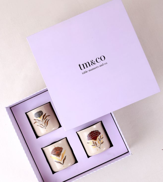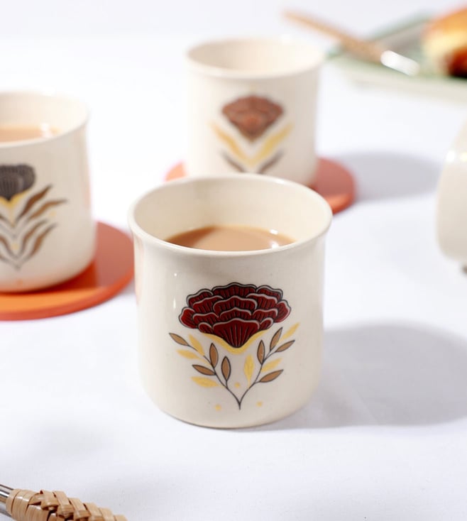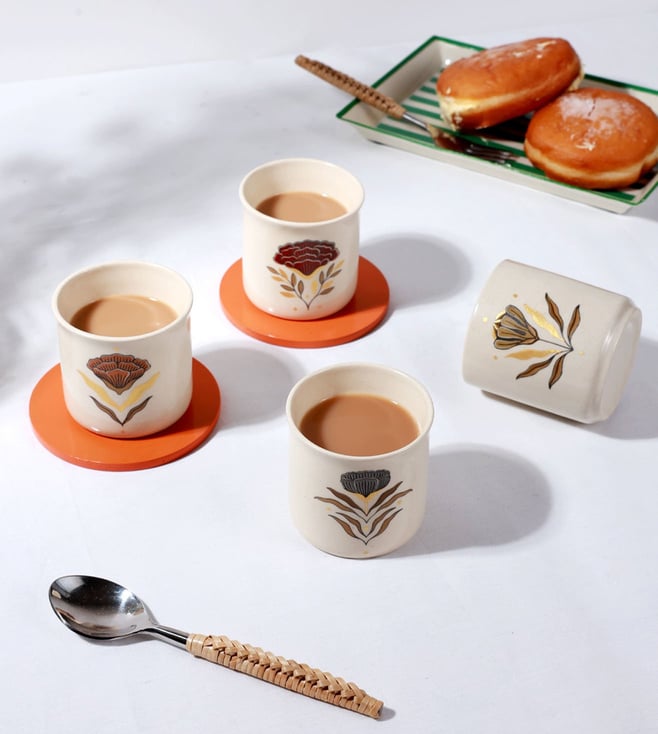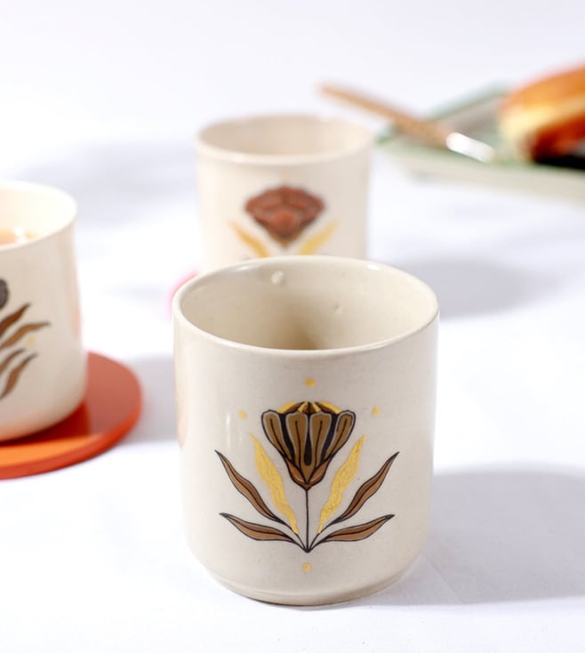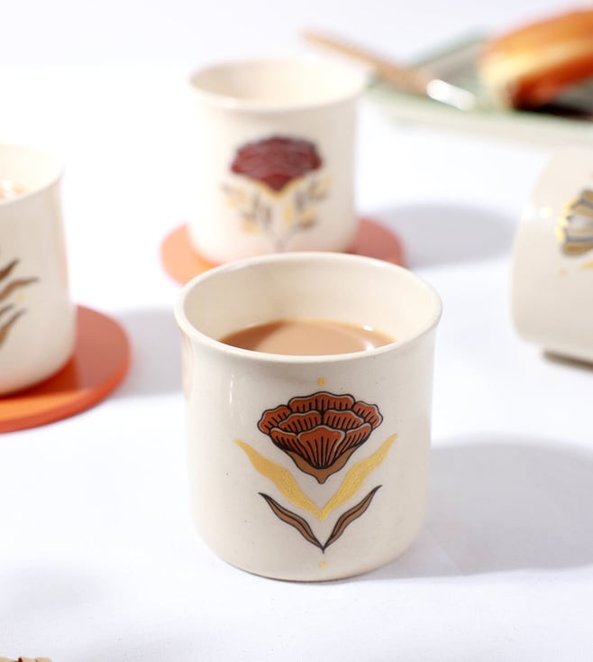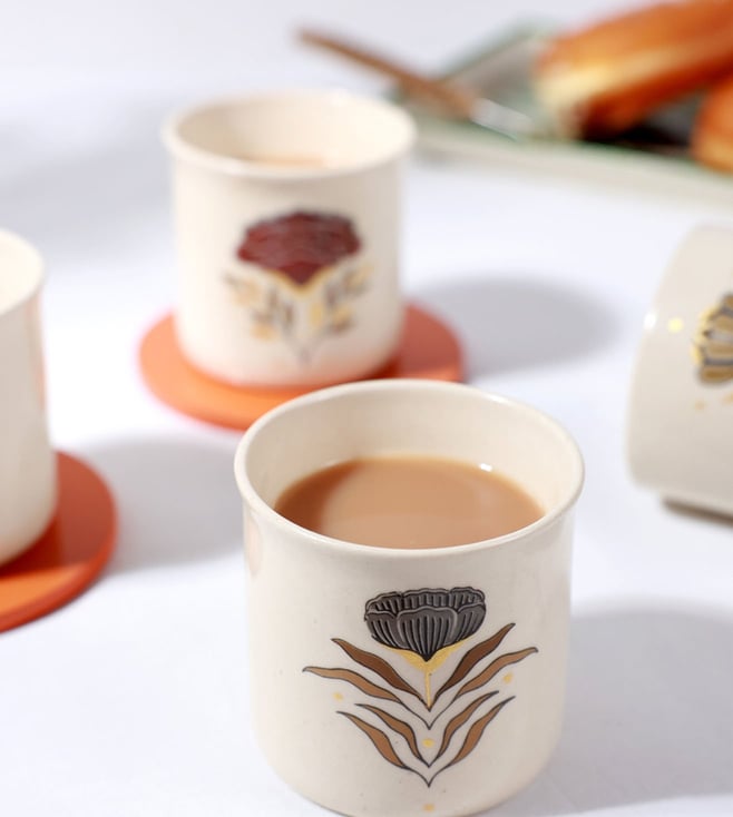 Bring timeless charm to your gifting with this beautifully curated set of 4 handmade stoneware kulhads. Each kulhad features a natural glaze and a unique floral motif, delicately accented with gold foiling for an elegant, artisanal finish. Perfect for tea, coffee, or traditional drinks, this set is packed in a gift box, an ideal present for festive occasions, housewarmings, or anyone who appreciates the art of slow sipping.