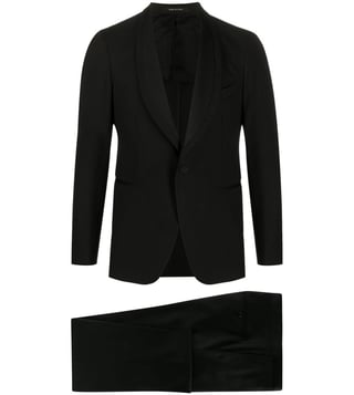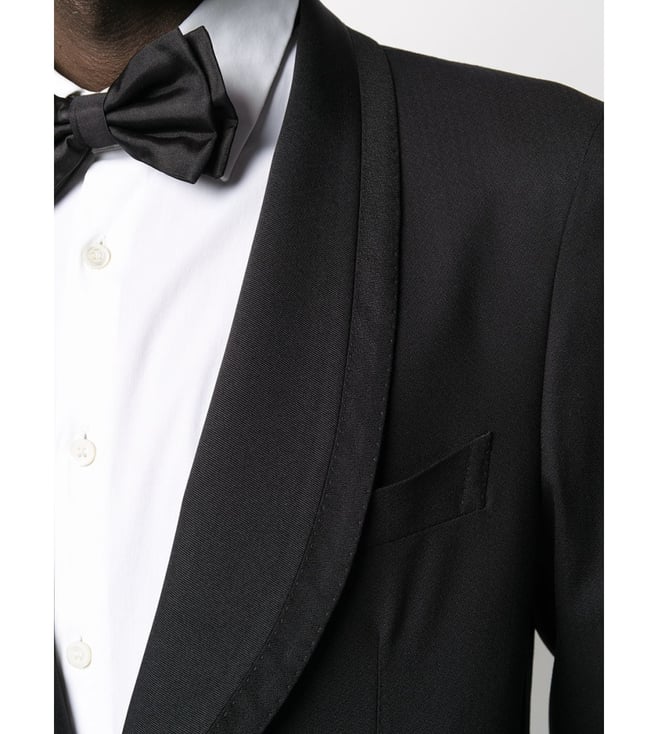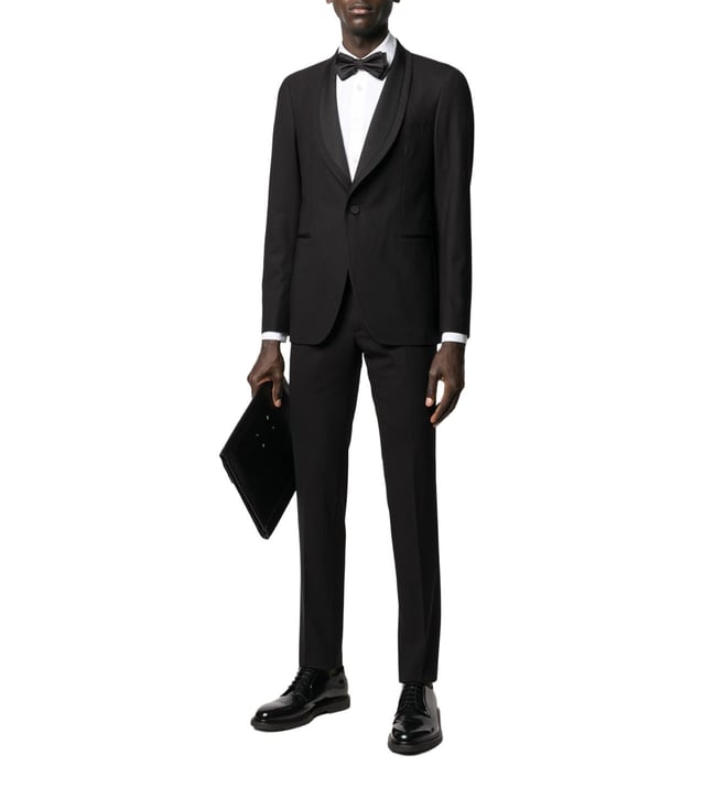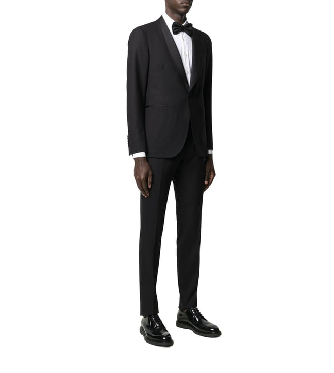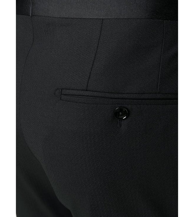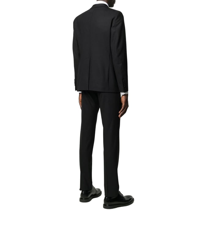 Elevate your style with the Tagliatore Black Tailored Fit Suit. Black wool tailored twopiece suit from tagliatore featuring a jacket with notched lapels, a chest pocket, long sleeves, button cuffs, a front button fastening and side flap pockets. The trousers feature a mid rise, a button and zip fly, a waistband with taglia it.