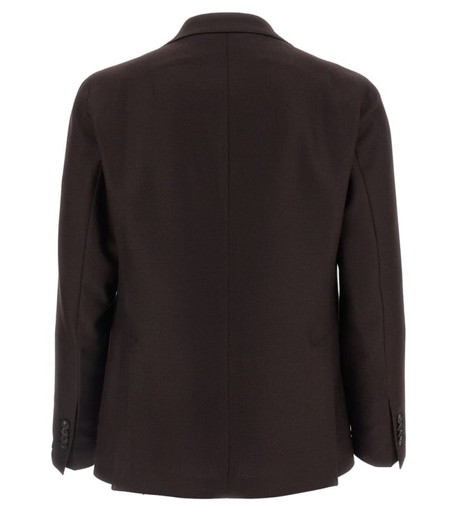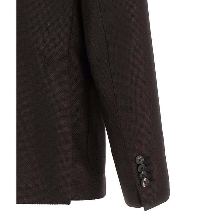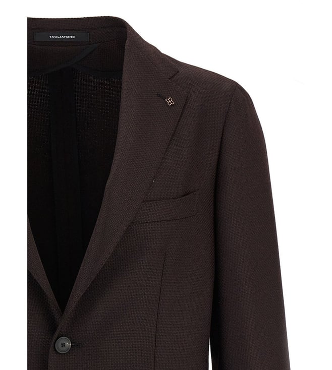 Elevate your style with the Tagliatore Maroon Blazer. Super 100's wool blazer micro checkered weave, singlebreasted unstructured model with front button closure, unlined, peak lapels with removable metal brooch, breast pocket, patch pockets, cuffs with open buttonholes, back vents. True to size fit. Products purchased from Darveys are supported exclusively by the warranty/exchange policies of Darveys and its partner boutiques. Brand owners and their channel partners are not responsible for exchange/warranty services for items purchased through Darveys.