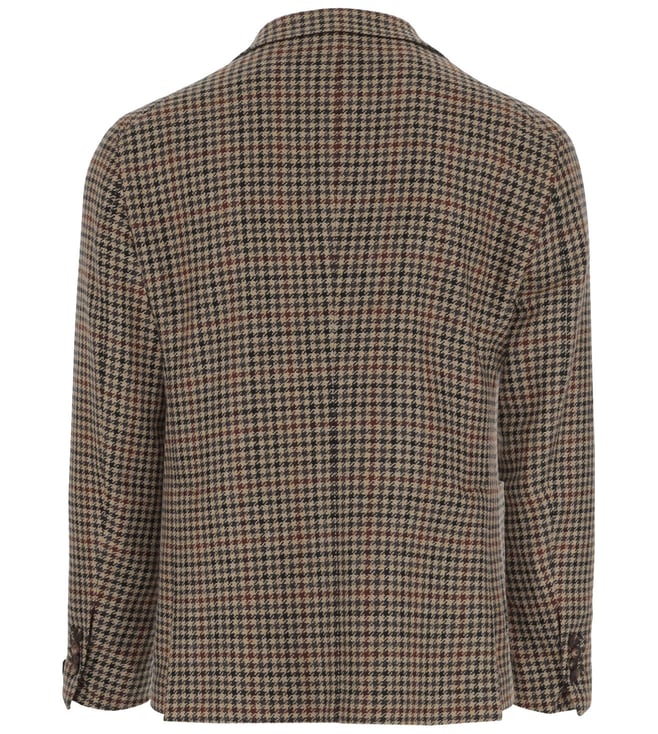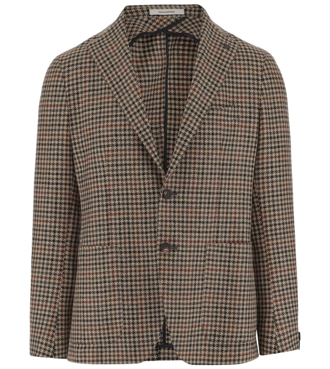 Elevate your style with the Tagliatore Beige Houndstooth Single Breasted Blazer. Jacket made of wool and blend x000D revers x000D chest pocket x000D long sleeves x000D front pockets x000D all-over check pattern x000D multi x000D made in Italy x000D composition: 95% wool, 5% the model is wearing size 48 it. Model measurements: height: 185 cm chest: 94 cm waist: 75 cm hips: 93 cm shoulder: 48 cm.