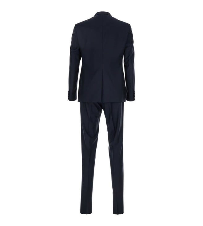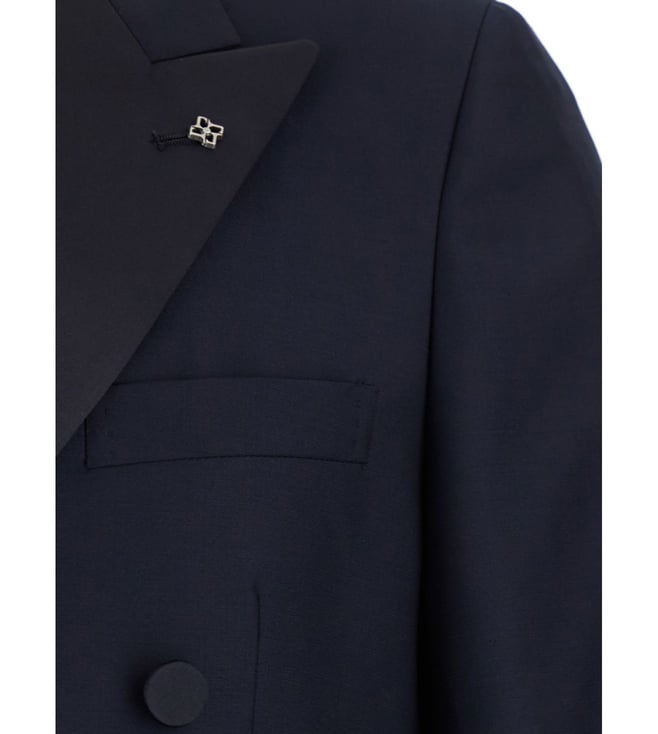 Regular fit, jacket, double-breasted jacket, satin peak lapels with logo pin, long sleeves, front button closure, covered buttons, one breast pocket, two welt pockets on the front, cuffs with buttons, pants, slim model, front closure. Products purchased from Darveys are supported exclusively by the warranty/exchange policies of Darveys and its partner boutiques. Brand owners and their channel partners are not responsible for exchange/warranty services for items purchased through Darveys.
