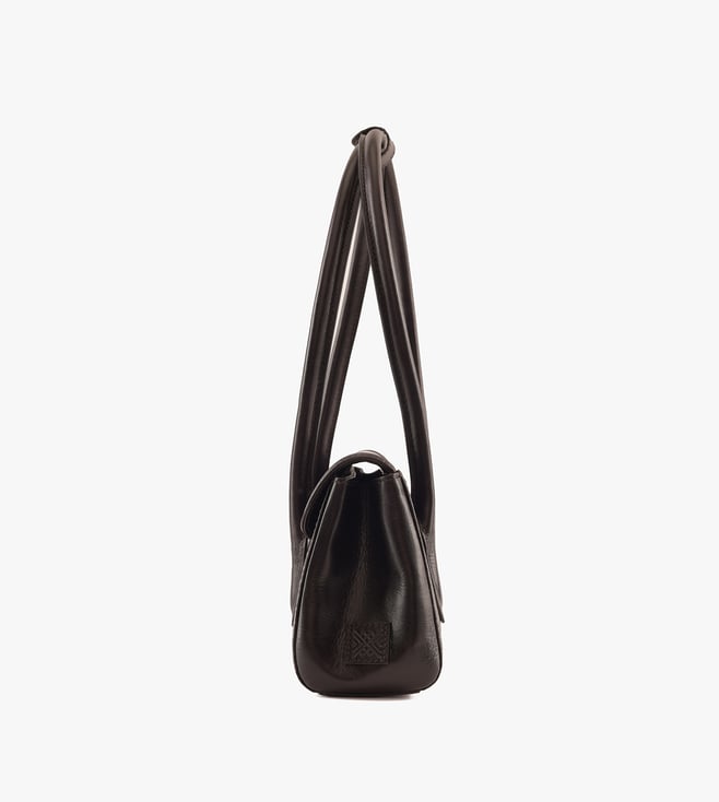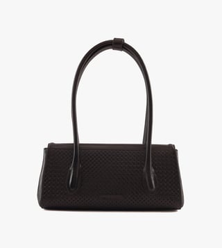 Inspired by Spain, this sleek, structured top handle shoulder bag balances poised power and soft femininity. Crafted in full-grain vegetable tanned leather with basket weave emboss and antique hardware. Dress it up or down, with a larger size available. Turn lock closure, one main compartment, interior zipper pocket, natural polydrill lining, buff antique fittings, YKK zippers.