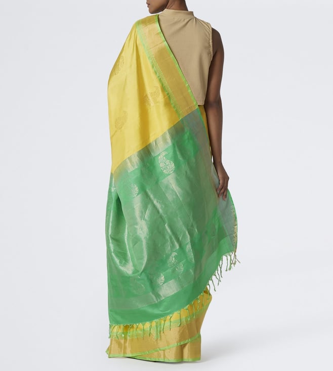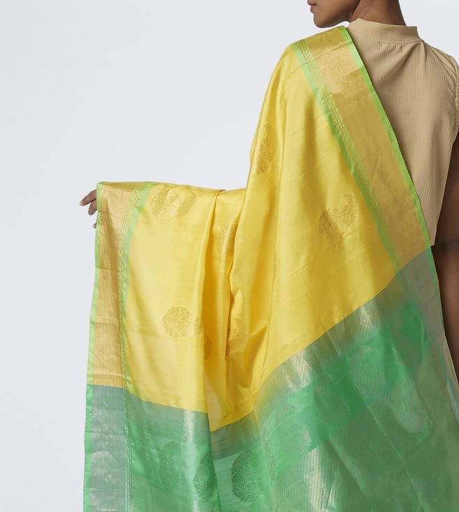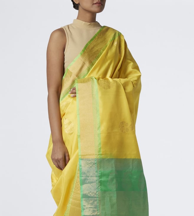 Add a hint of feminine grace to your attire by wearing this light yellow South silk handloom saree from Taneira. It has been designed with an extra weft and is sure to be your personal favourite. Disclaimer: The blouse in the image is only for display purpose and will not be a part of the delivery content.