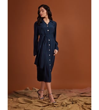Discover the epitome of elegance with this midi shirt dress, meticulously made from the most luxurious fabric. Impeccably designed, it boasts a timeless collar and a coordinating belt to accentuate your feminine figure. To create a mesmerizing and alluring ensemble, slip into a pair of strappy gold sandals that radiate glamour with every step you take. Disclaimer : Product color may vary slightly due to photographic lighting sources.