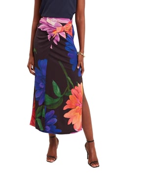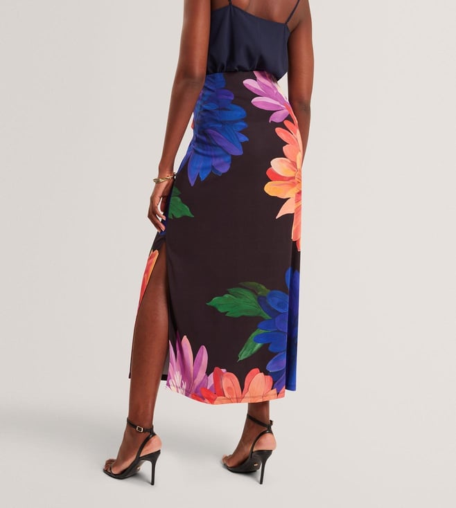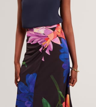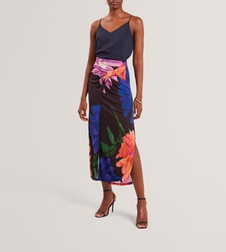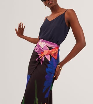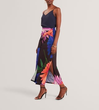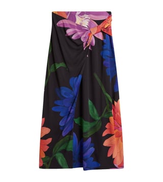 An elegant blend of femininity and ease, this black midi skirt from Ted Baker features a striking wrap design with pleat detailing at the front. Adorned with large, multicoloured floral prints and finished with a chic side slit, it flows effortlessly in soft, fluid fabric. Pair it with a solid camisole top and strappy heels for a refined look. Established in 1988, Ted Baker is a British luxury brand known for its creativity, charm, and quirk. Since day one, it has aimed to become the world's most captivating British lifestyle brand.