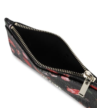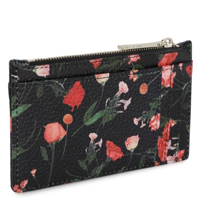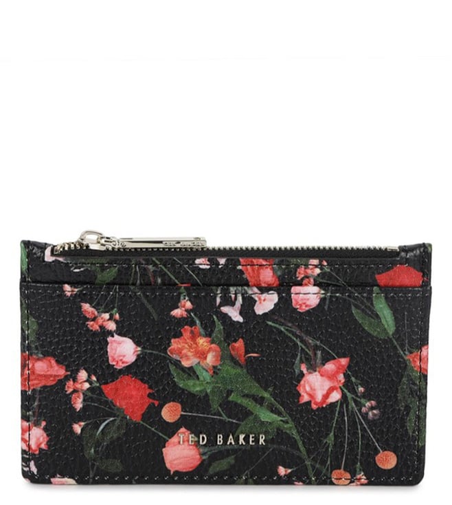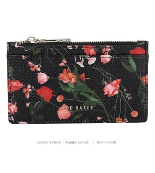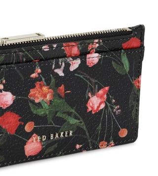 Presenting Ted Baker's black cardholder, a stylish essential with a charming floral print. This sleek accessory boasts practical features like card slots and a zip pocket for efficient organization. The branded hardware adds sophistication, making it the perfect blend of style and functionality for your everyday carry.