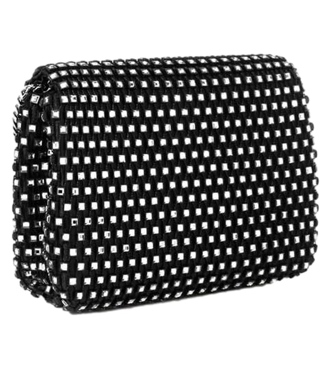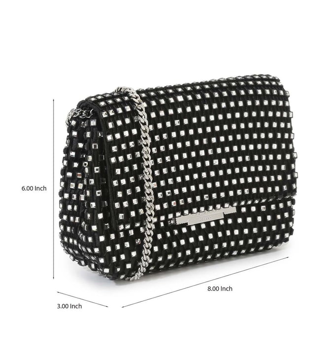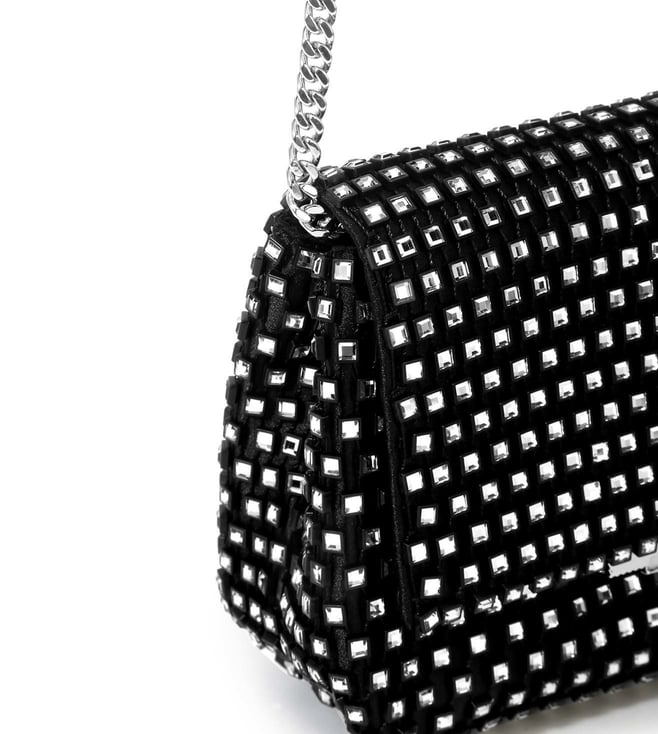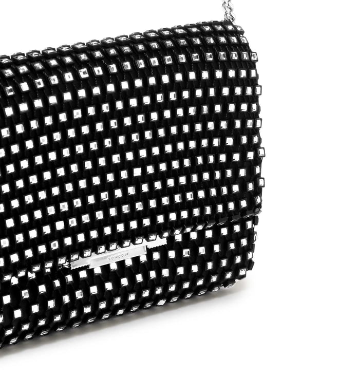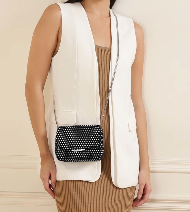 Stunning and sleek, this black sling bag from Ted Baker is a must-have for those with refined taste. Adorned with black crystals on a chic mesh design, it features a gold-toned chain strap for effortless crossbody wear. The flap, equipped with a press and lock closure, reveals a single compartment for your essentials. With its stylish appeal, this bag embodies Ted Baker's commitment to nature, longevity, perseverance, and nobility, ensuring there's a signature piece for everyone in the collection.