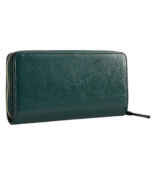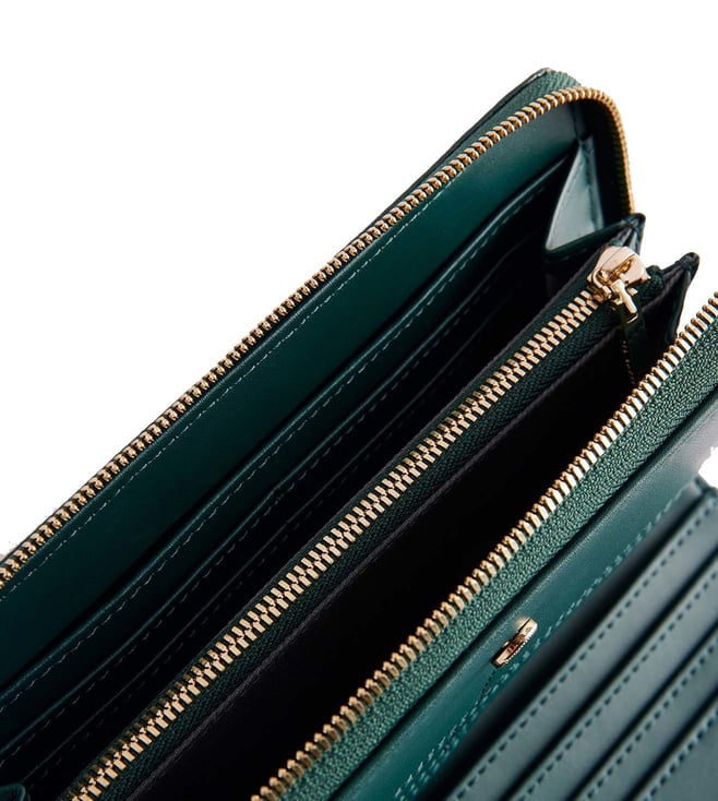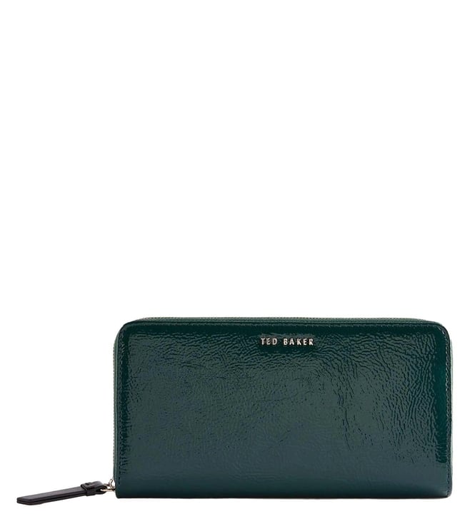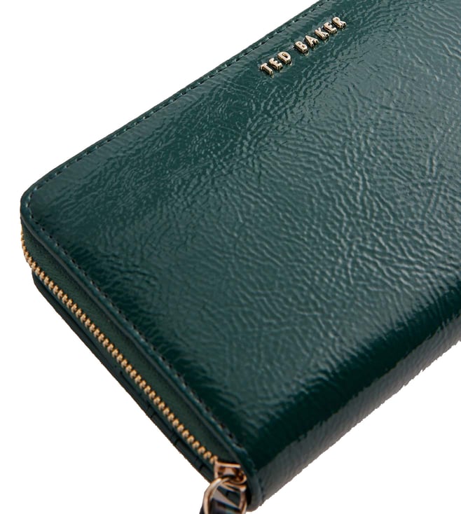 The green DALIEA purse by Ted Baker combines stylish flair with practicality, featuring a grainy-textured exterior and a spacious cotton-lined interior. Finished with debossed branding on the front, this versatile purse is perfect for carrying cards, cash, and coins securely. It includes multiple card slots, an internal zip pocket, and a webbing zip tab for added convenience. Known for its attention to detail and commitment to quality, Ted Baker has established itself as a leading lifestyle brand since 1988.
