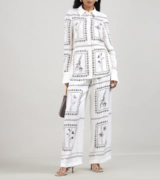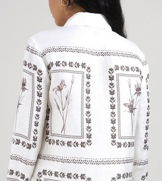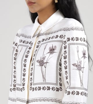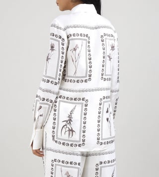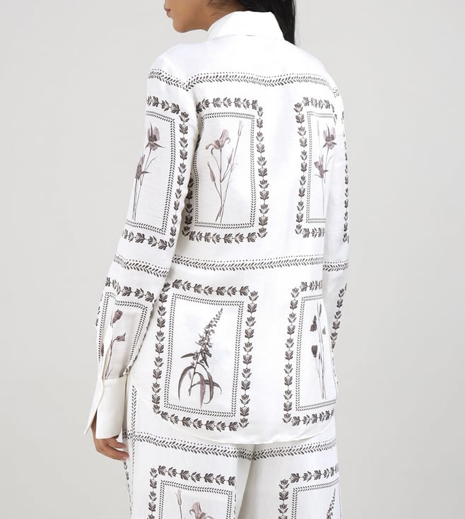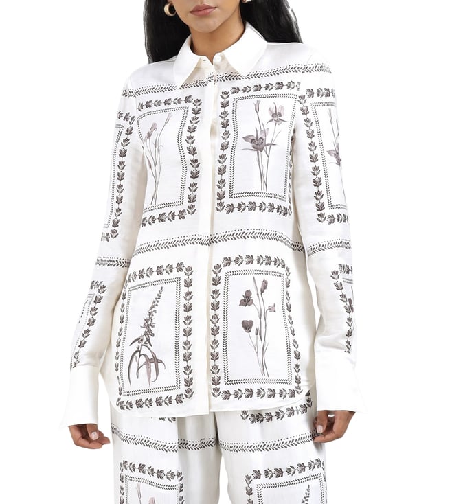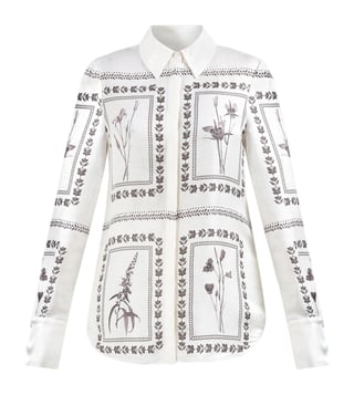 Elevate your wardrobe with this exquisite ivory shirt, a harmonious blend of 80% linen and 20% silk, offering a luxurious feel and breathable comfort. The regular fit gracefully contours the silhouette, while the elegant printed pattern adds a touch of sophistication. Designed with long sleeves and a classic shirt collar, this piece exudes timeless charm. The button closure ensures a seamless finish, making it a versatile addition for any occasion, effortlessly balancing style and elegance for the modern woman.