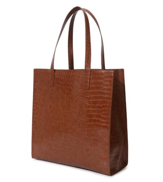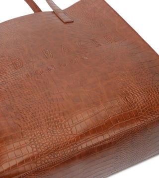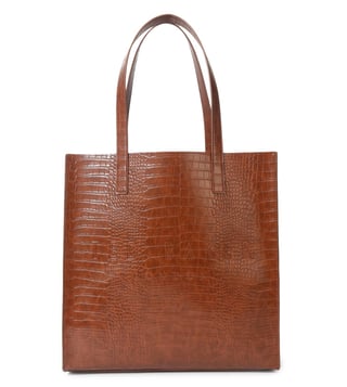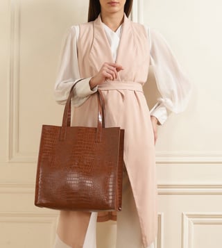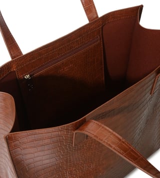 Make a striking statement with this tan large tote bag designed for women. The edgy appeal is accentuated by the croc-skin detail, and the bag offers versatility with its top handles and shoulder strap. Having a spacious compartment with an internal zip pocket, this bag allows safe and convenient storage of your stuff. This bag serves as a perfect accessory to complement any outfit.
