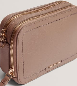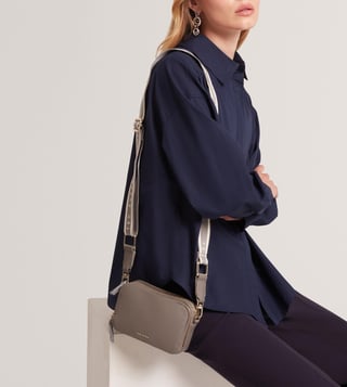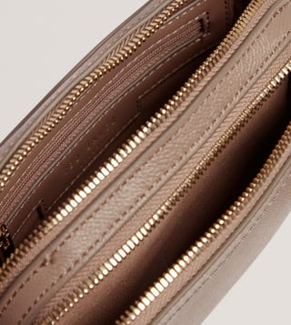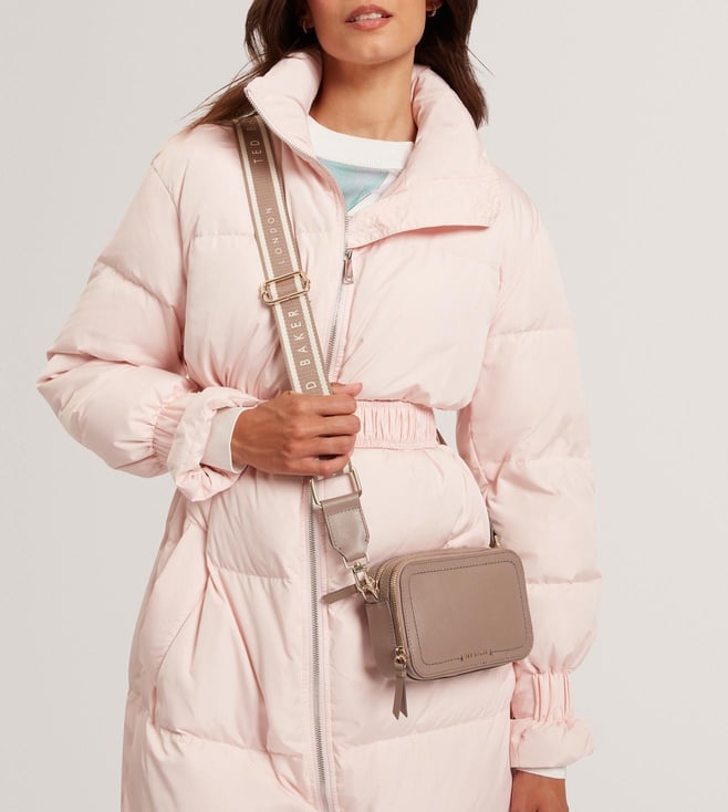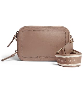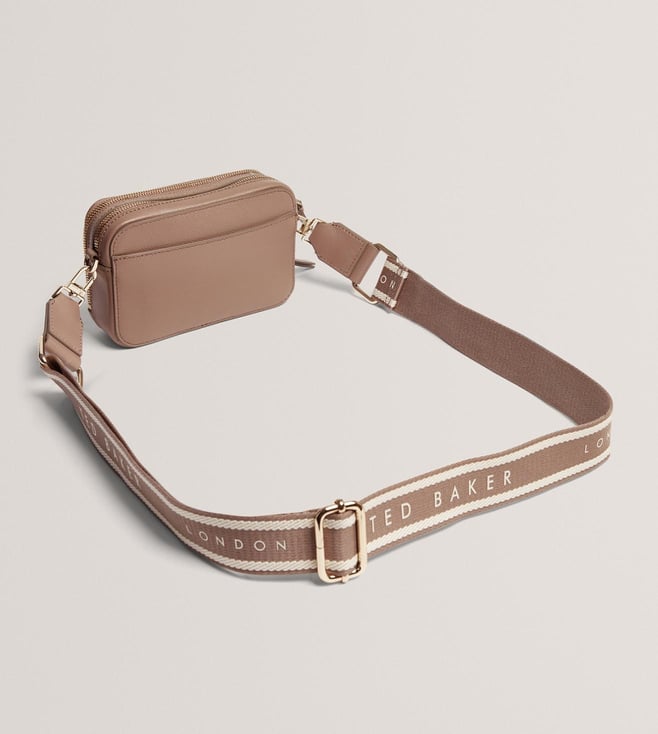 This taupe sling bag offers modern versatility with its solid design and textured finish. Featuring a secure top zip closure, striped shoulder strap, and front logo detail, it is the perfect accessory for everyday wear. Established in 1988, Ted Baker is a British luxury brand known for its creativity, charm, and quirk. Since day one, it has aimed to become the worlds most captivating British lifestyle brand.