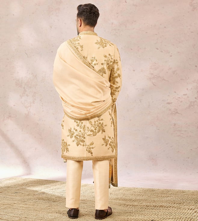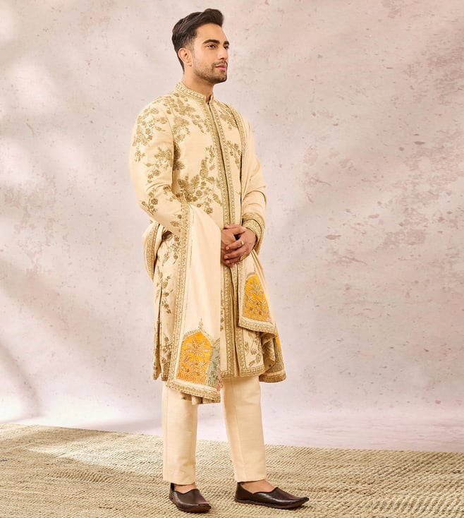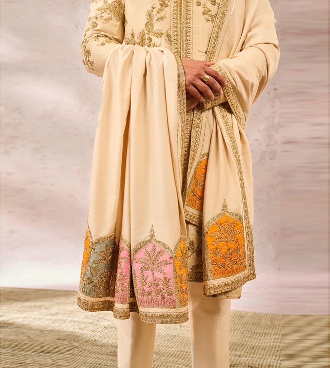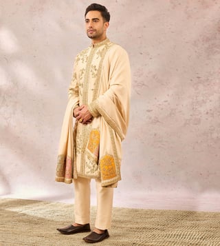 The Bombay Barfi Sherwani paired with an optional Jhorkha Shawl is an ensemble for classic groom. This dapper sherwani is embelished with heavy gold embroidery that is inspired by 'Berry Bel', 'Gul Jharokha" and is further eleveated with ornated 'Moti Chala' work.