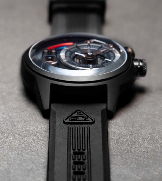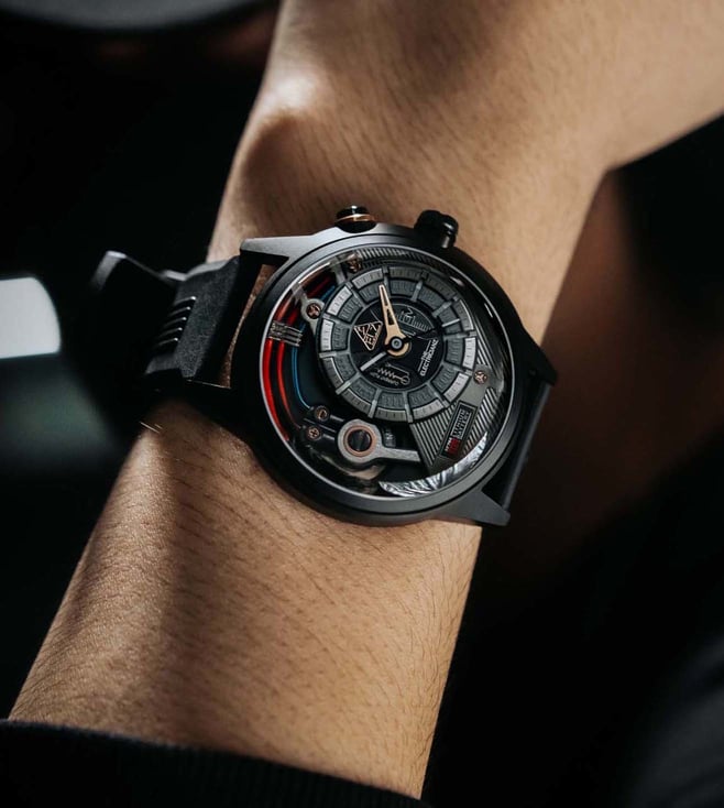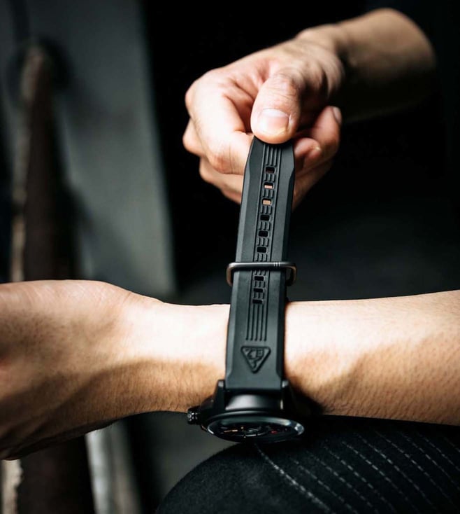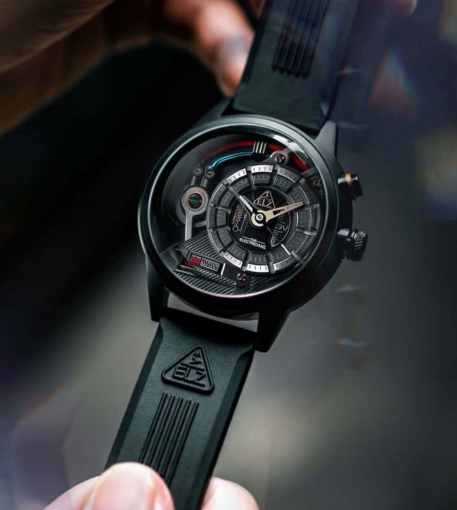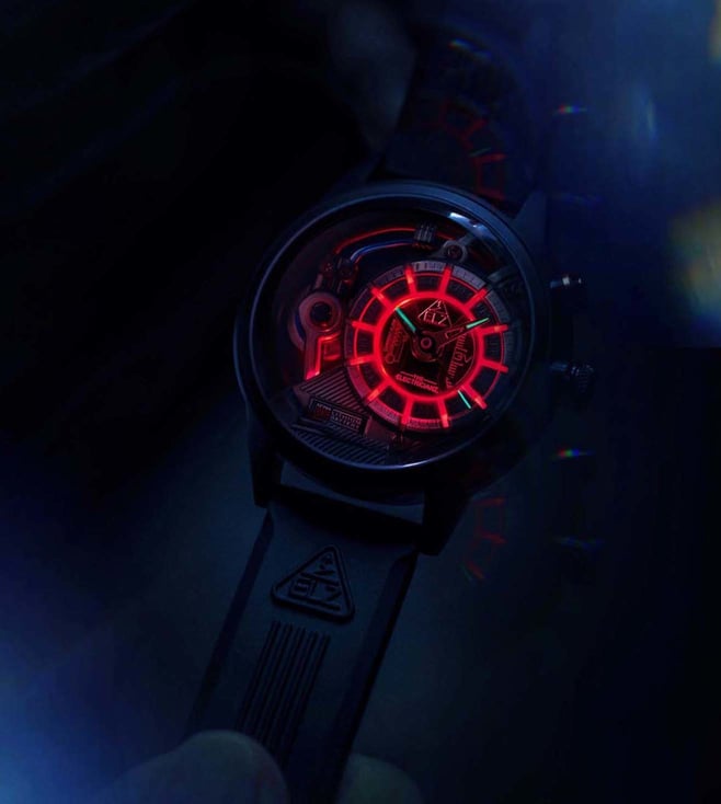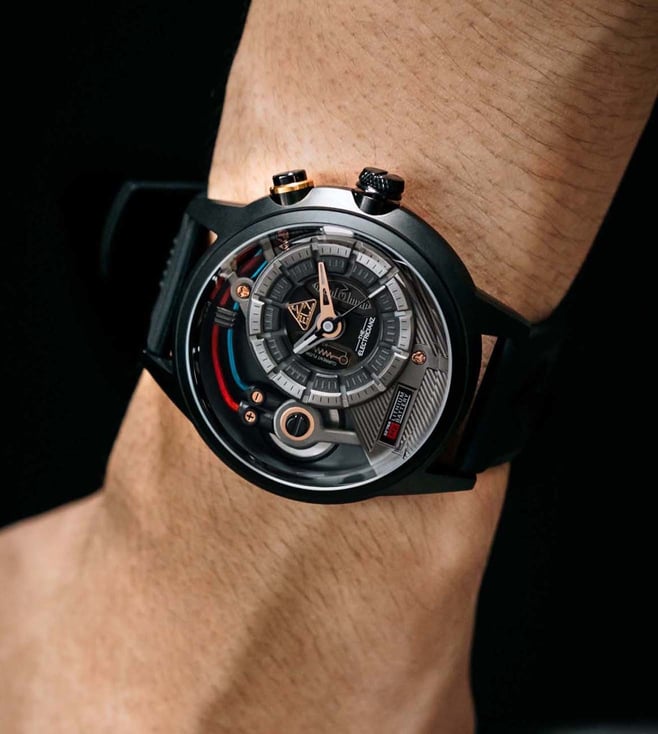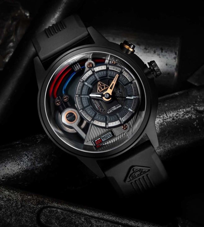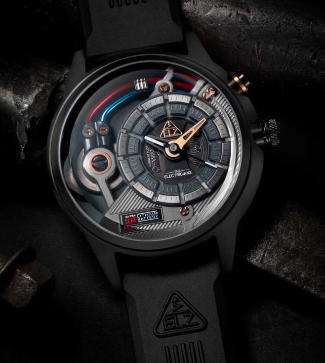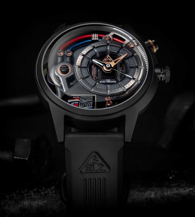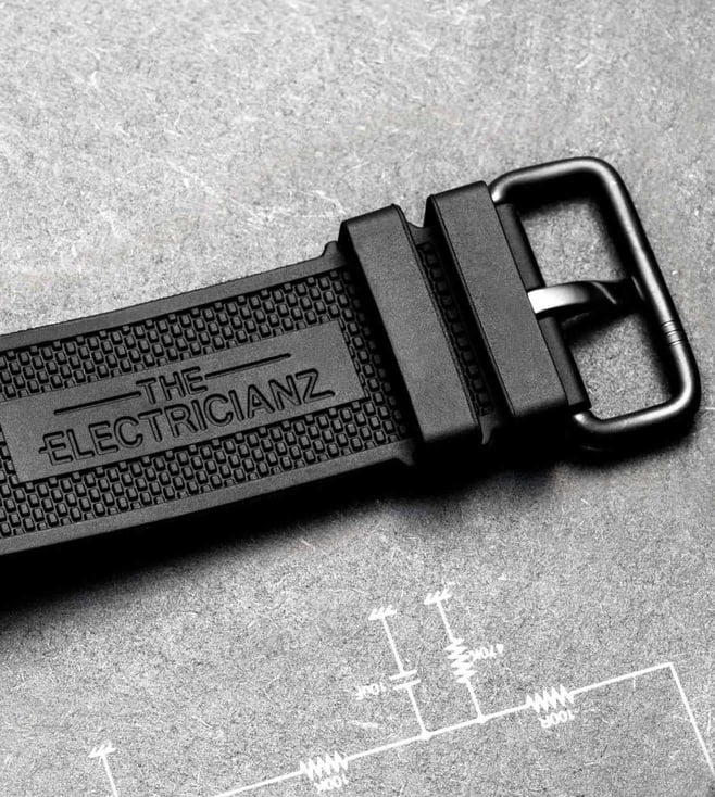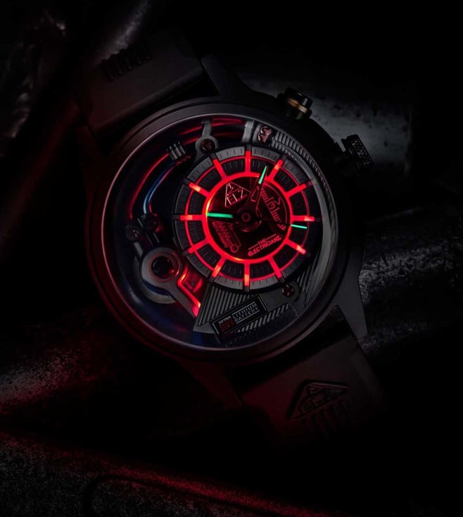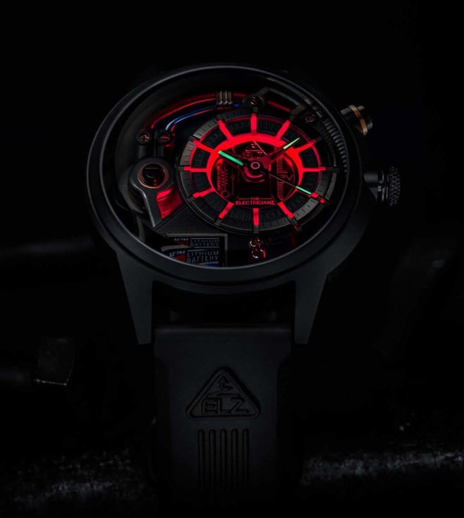 The Electricianz is about bringing top quality driven by Swiss know-how in watch design and technology. The Dark Z is the definition of mesmerising style. An embossed rubber strap draws you into the alluring darkness. With a stainless steel case capturing the passion of the night and the copper detailing igniting the mesmerising style. The in-house electric module paired with quartz movement is undeniably unique. Pressing the top pusher ignites the 5 red LED backlights illuminating the watch face in a captivating red glow.