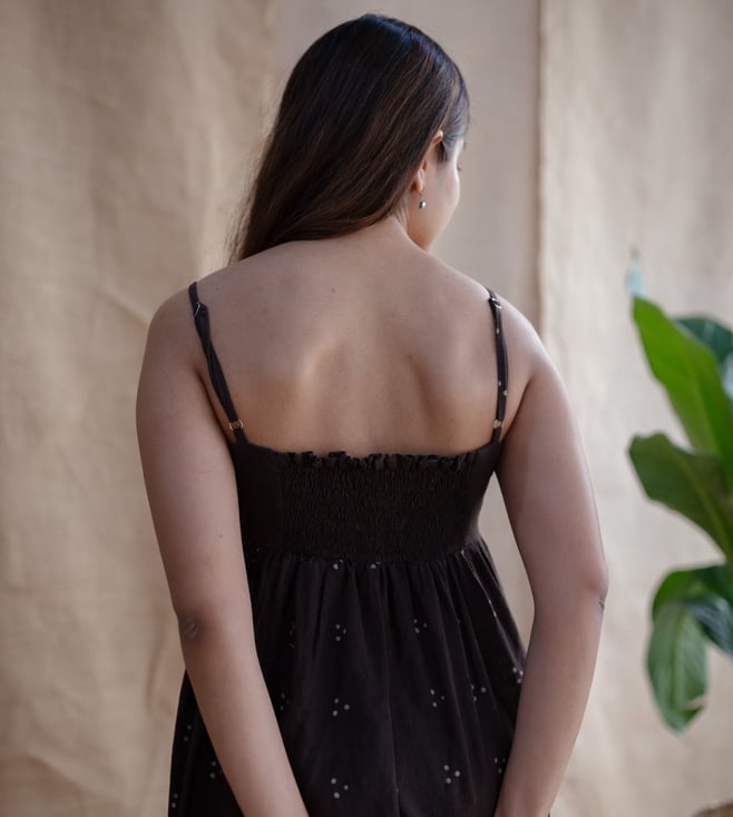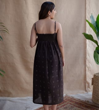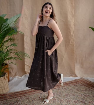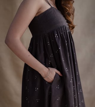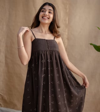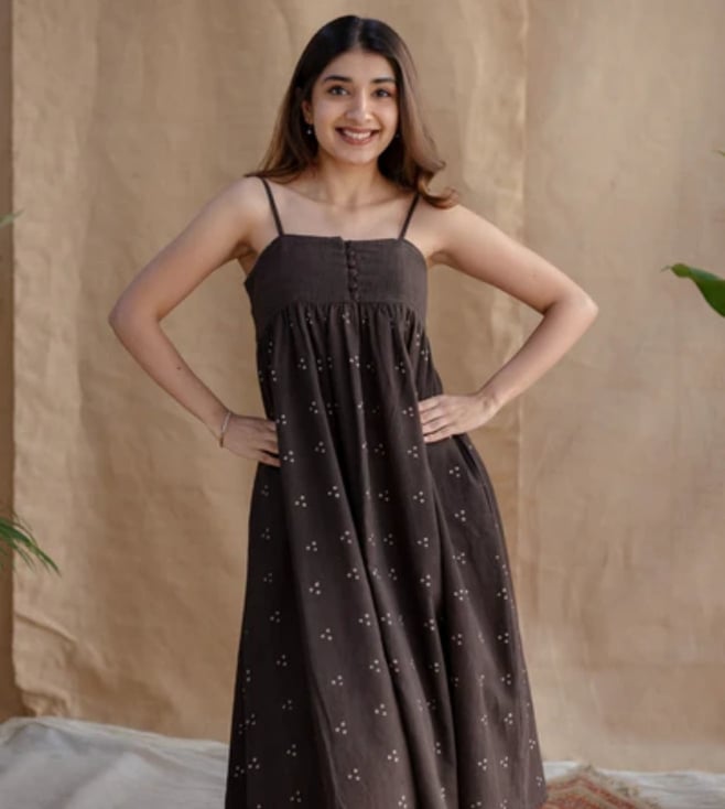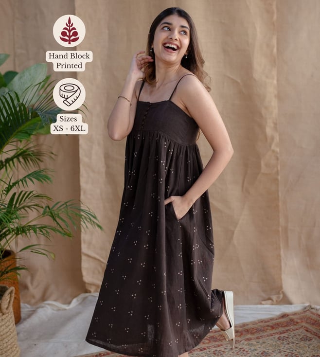 Elevate your style with The Indian Ethnic Co Charcoal A-Line Dabu Handblock Printed Slub Cotton Dress. This chic dress features a square neck and sleeveless design, crafted from soft slub cotton with vibrant Dabu prints. The A-line silhouette ensures a flattering fit, perfect for casual or festive occasions. The charcoal hue adds sophistication. Pair it with minimal accessories for a polished look. Celebrate traditional craftsmanship with this versatile dress, designed for timeless elegance.