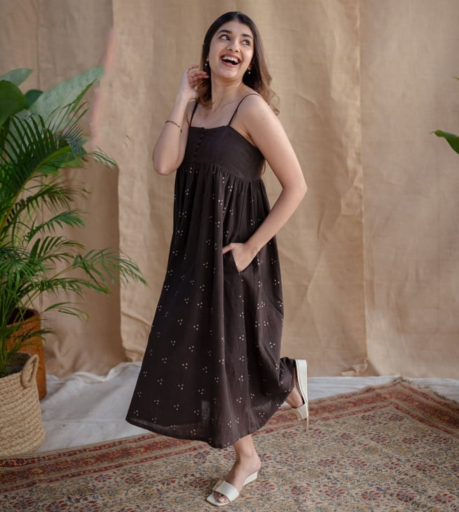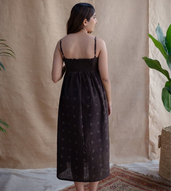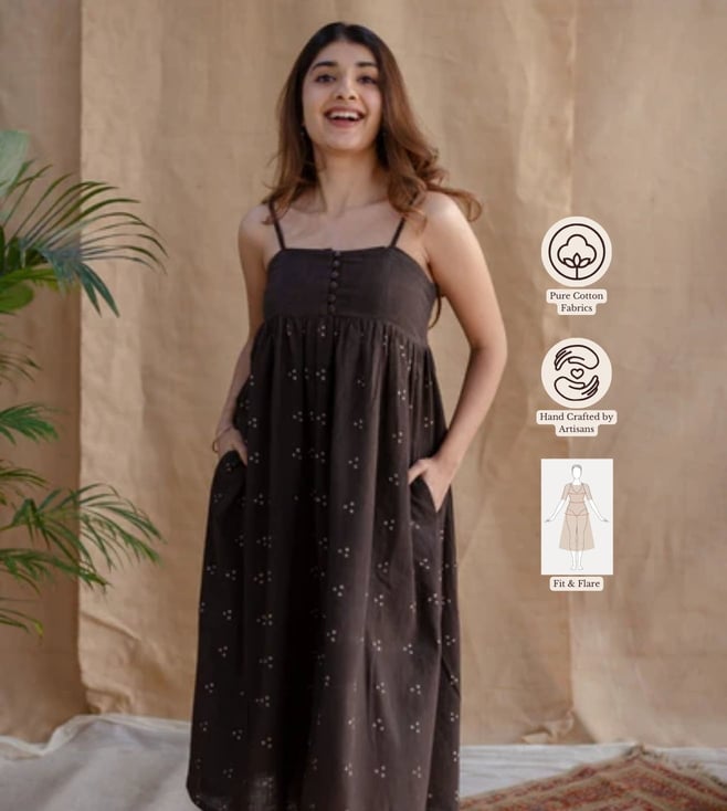 The Indian Ethnic Co Charcoal A-Line Dabu Handblock Printed Slub Cotton Dress