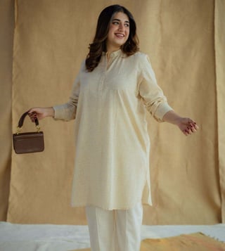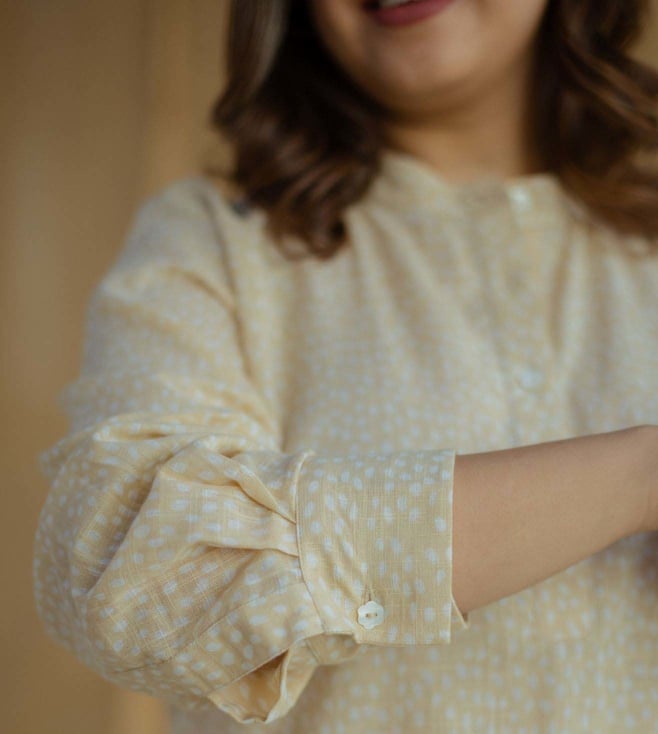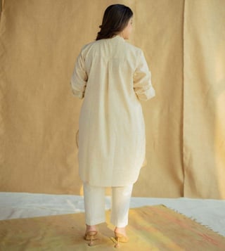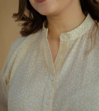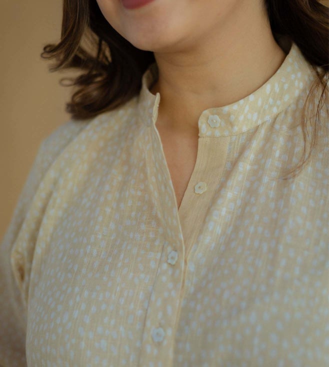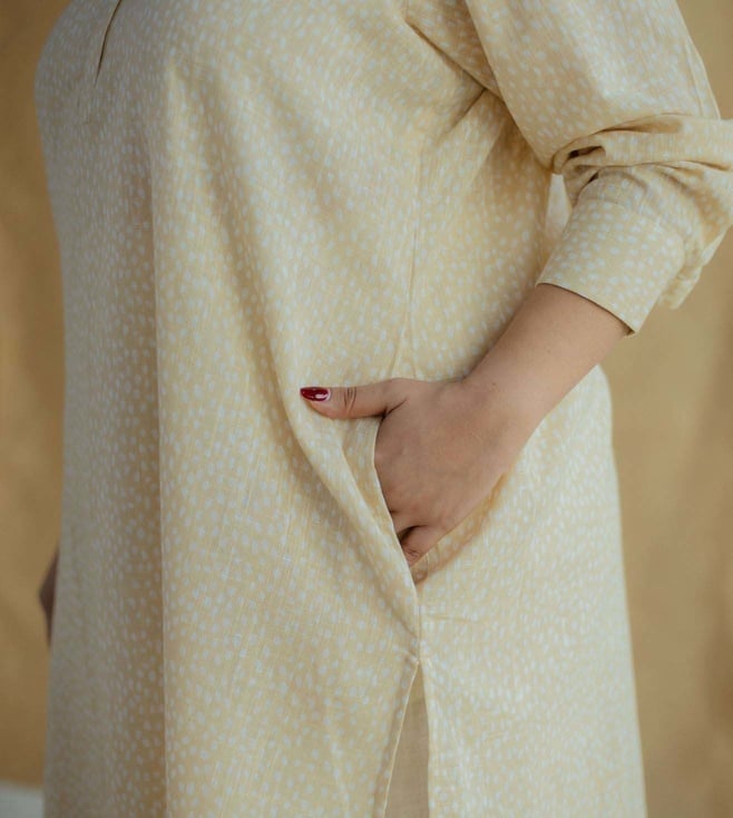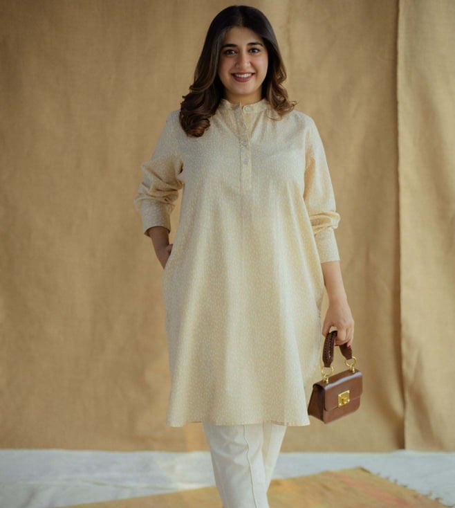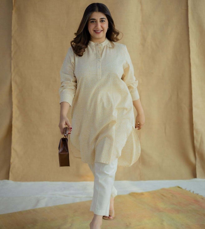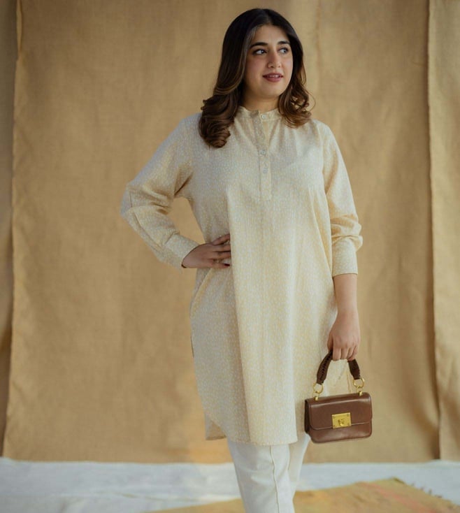 Pump up your style quotient with this beige a-line fit kurta from The Indian Ethnic Co Delilah. Tailored to sartorial perfection from premium quality fabric, it assures a soft and soothing touch against the skin. The mandarin collar augments its design. The printed pattern makes it a captivating choice.